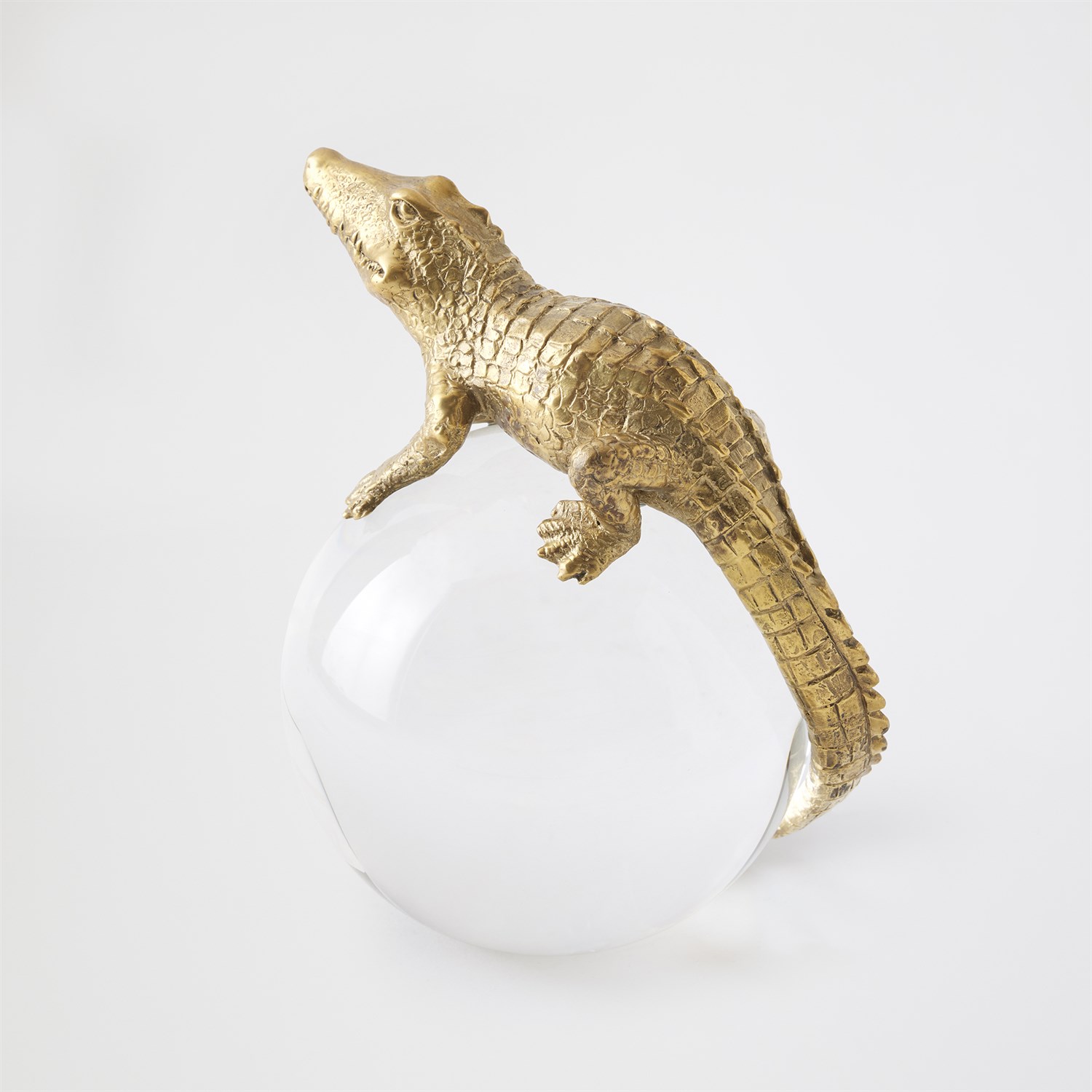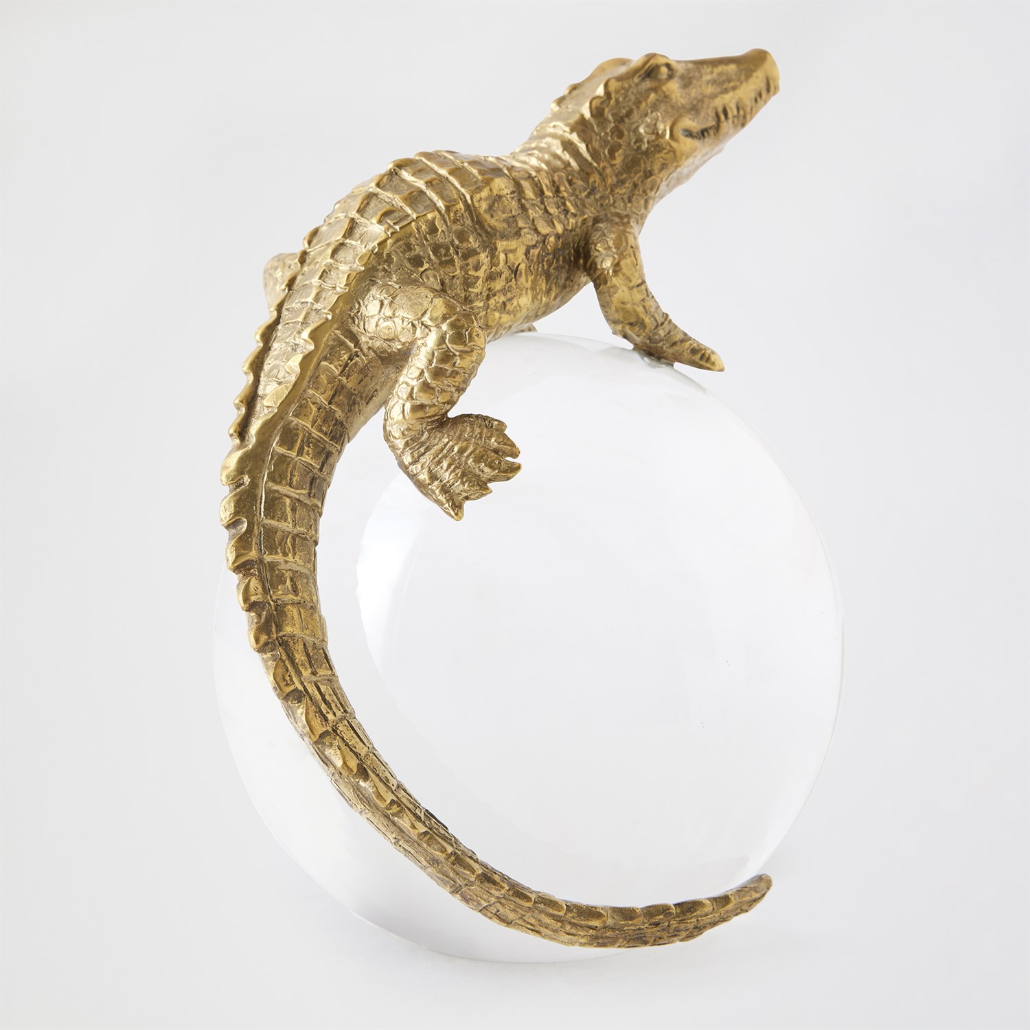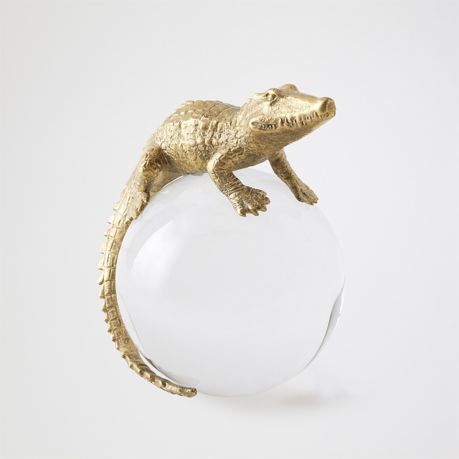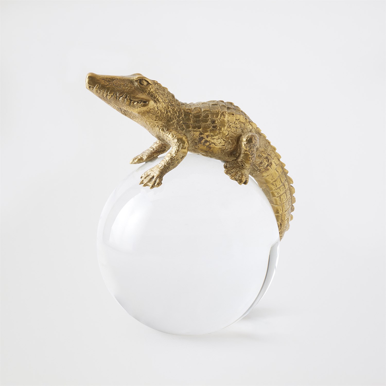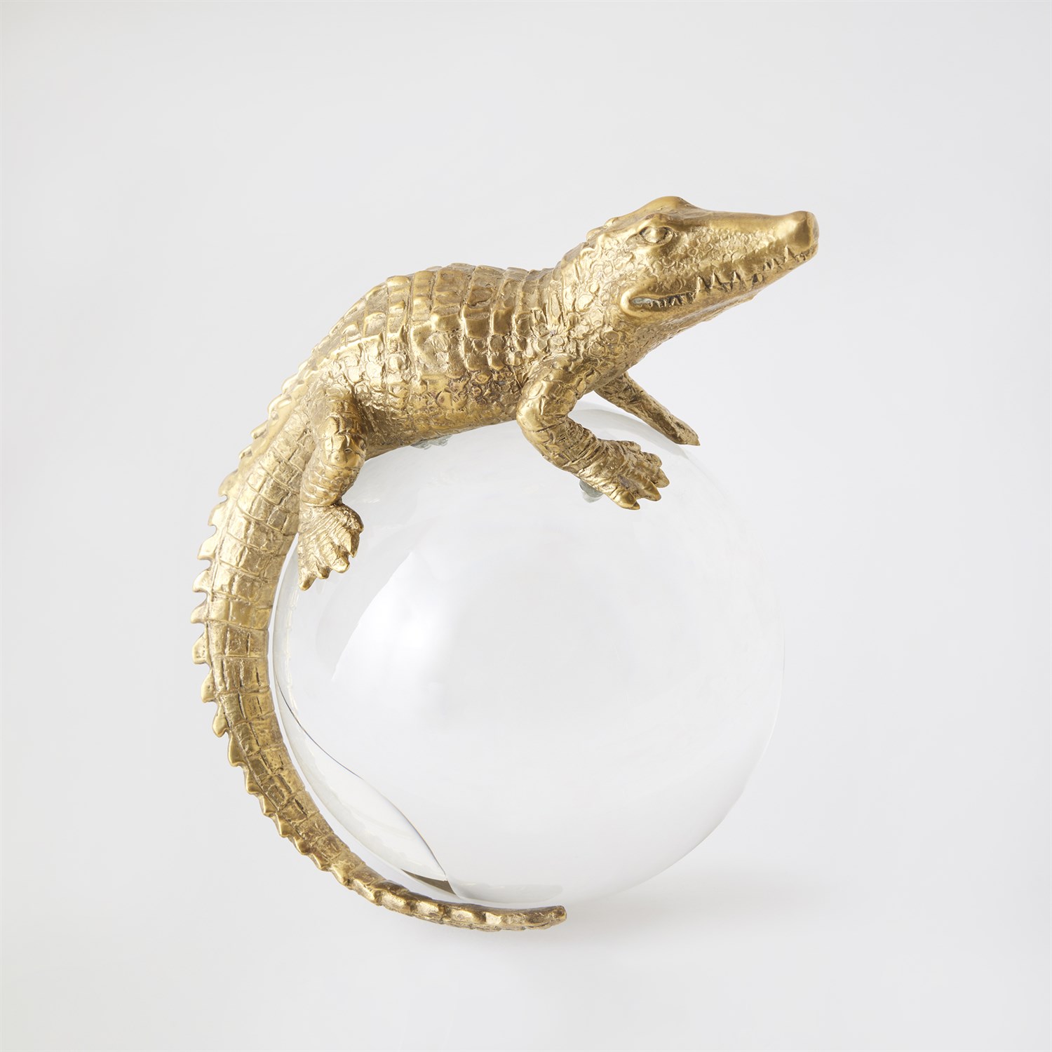 Finely detailed and masterfully cast in solid brass using the lost-wax technique, this Alligator on Orb sculpture captures the intricate textures and sinuous form of the reptile. Mounted atop a crystal orb, the piece creates a captivating interplay of material and light, blending natural inspiration with refined artistry for a striking decorative statement.