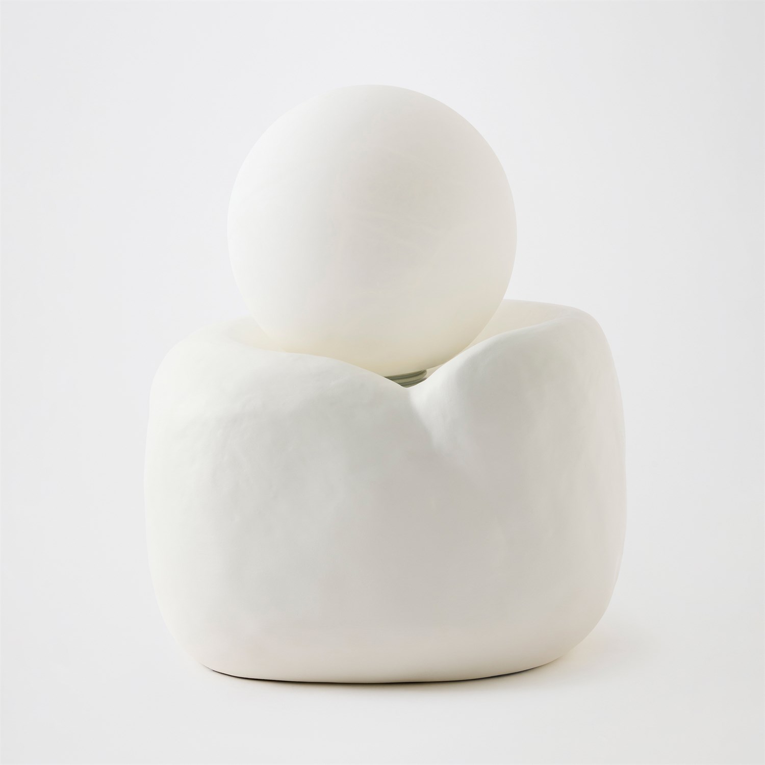 The Ampelus Lamp pairs a hand-formed white ceramic base with a glowing alabaster sphere that appears to hover within. The ceramic recalls wind-worn stone, while the illuminated sphere evokes the desert moon rising over still sand. Even the smallest light can hold back the desert night.