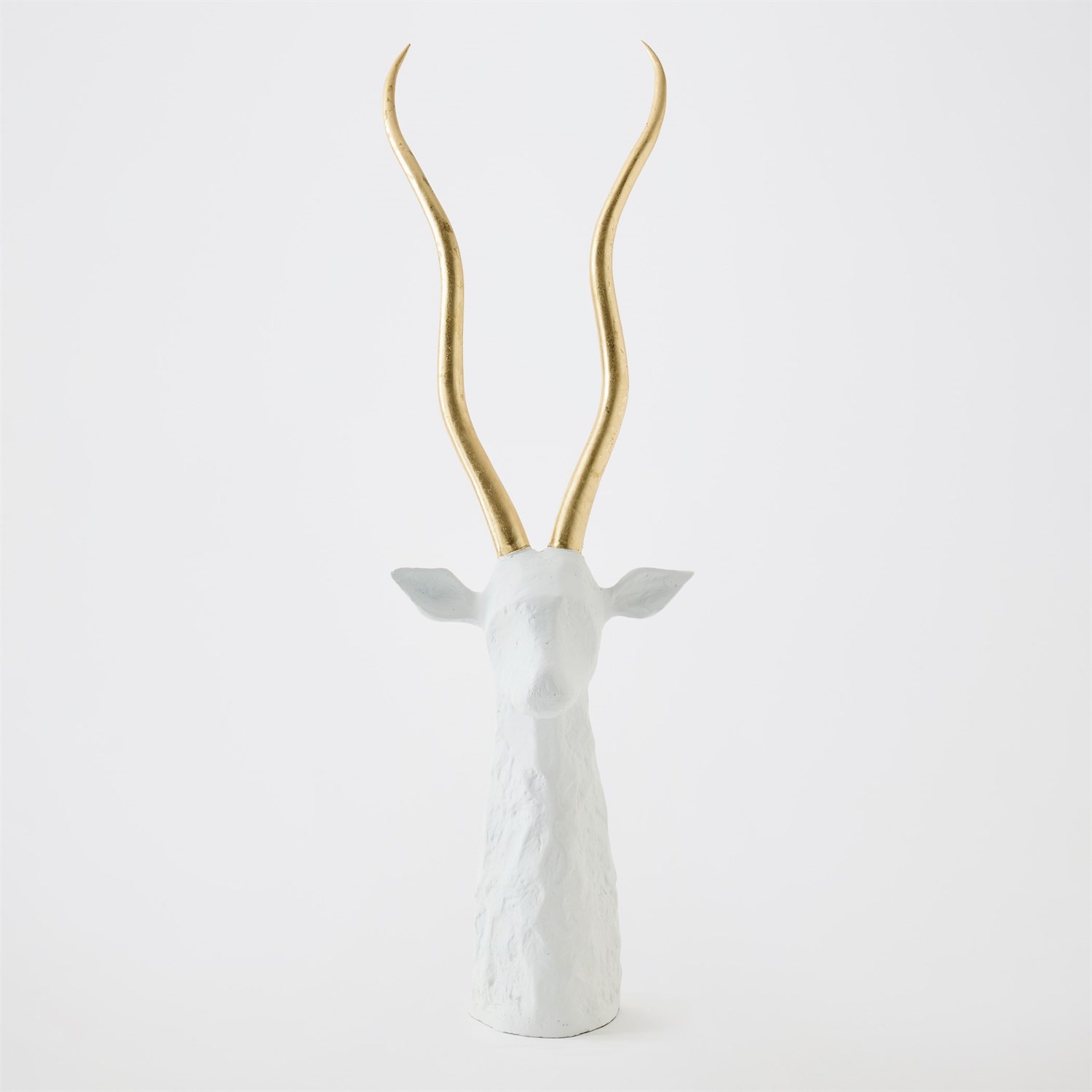 This abstract antelope sculpture transforms natural elegance into contemporary artistry. Crafted in lost-wax cast iron with a refined matte white finish, its sleek form is accented by striking gold leaf horns, creating a bold contrast. A sophisticated fusion of minimalism and luxury, it makes a captivating statement in any interior.