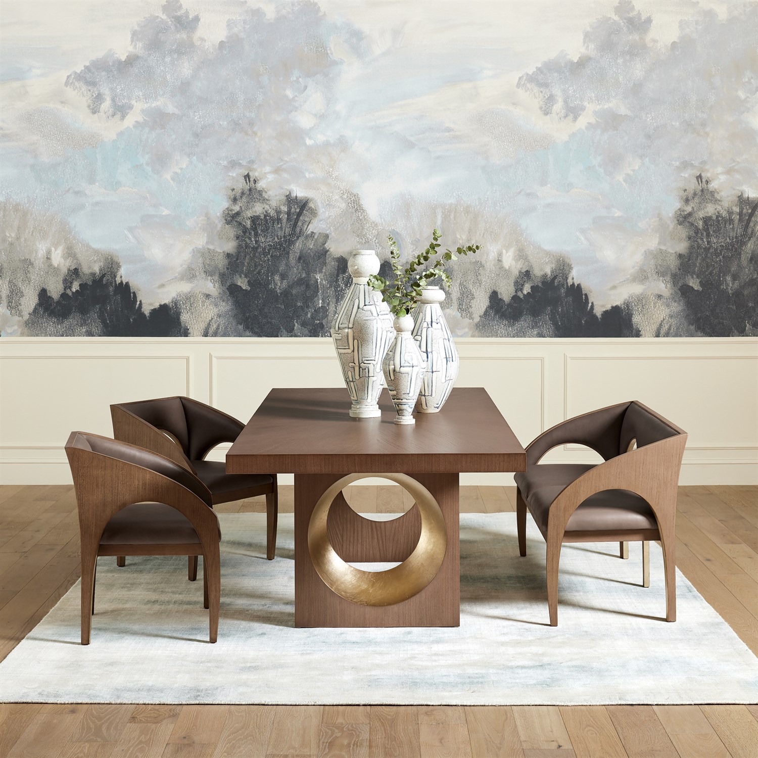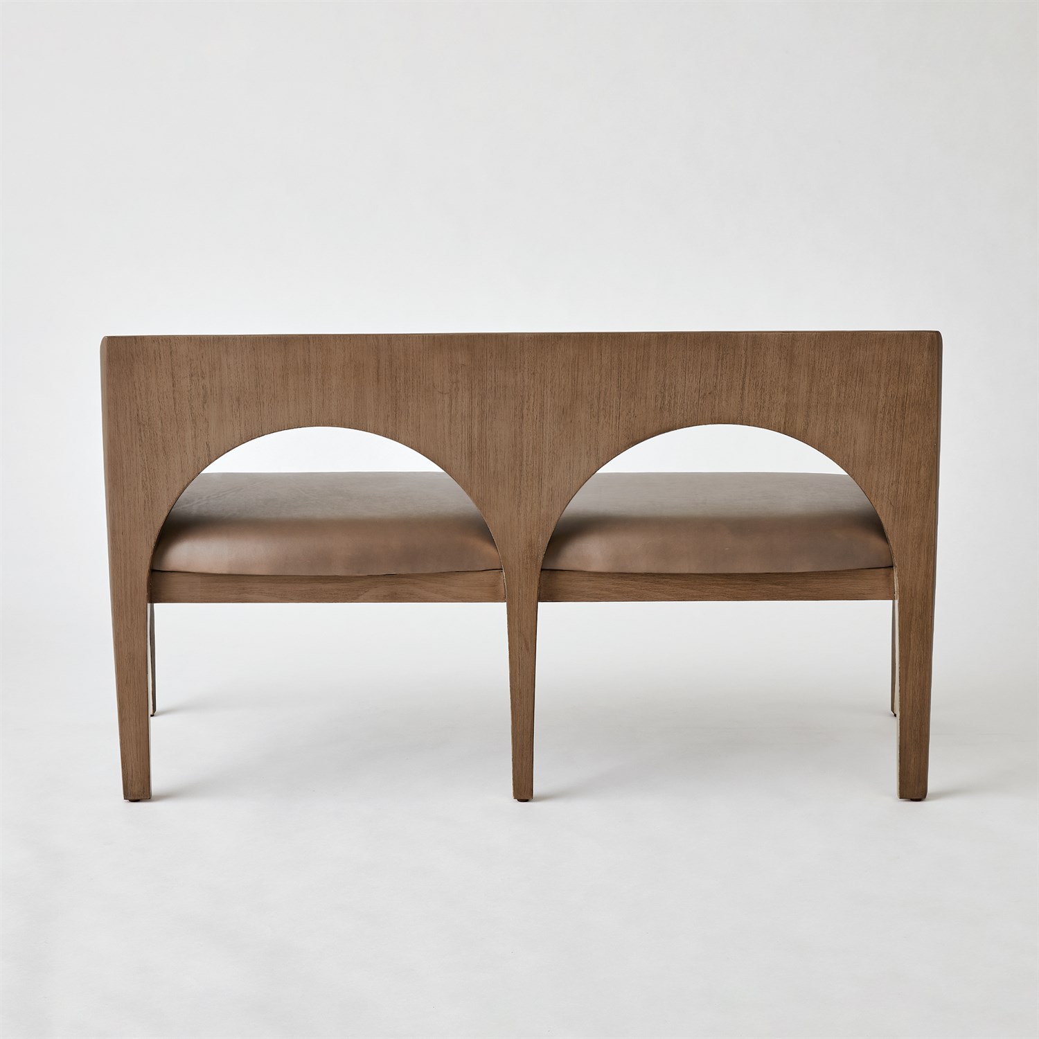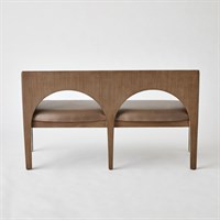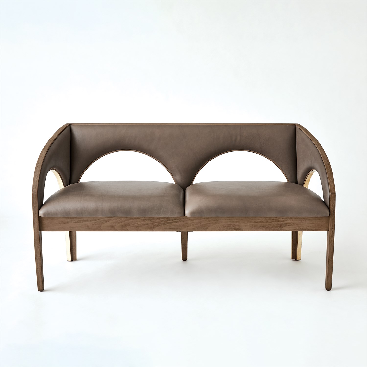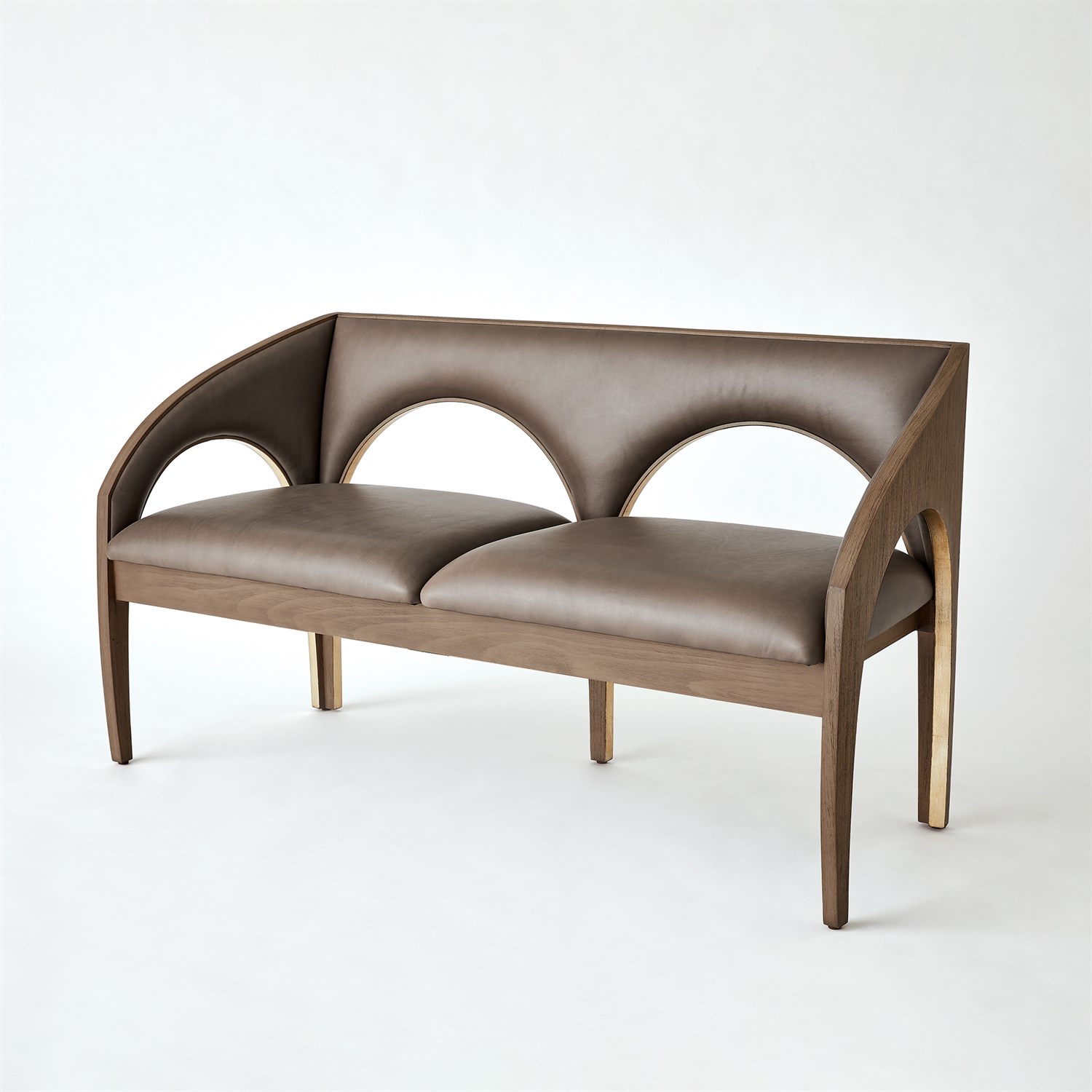 Our Arches Bench is covered in luxurious leather and has a dyed eucalyptus veneer frame. The cool nutmeg tones perfectly contrast with the gold leaf accents on the base and the steel stretcher.