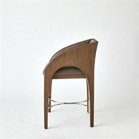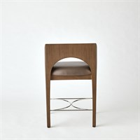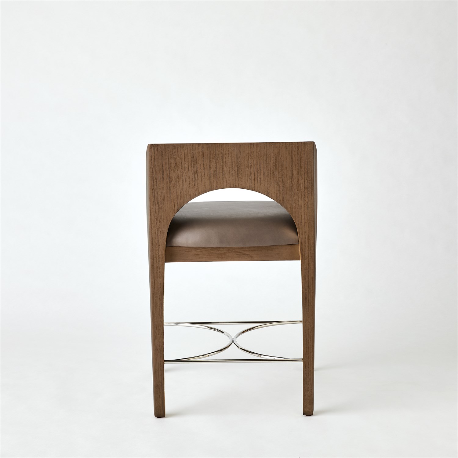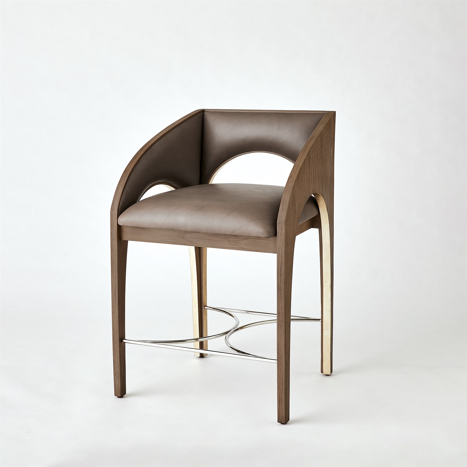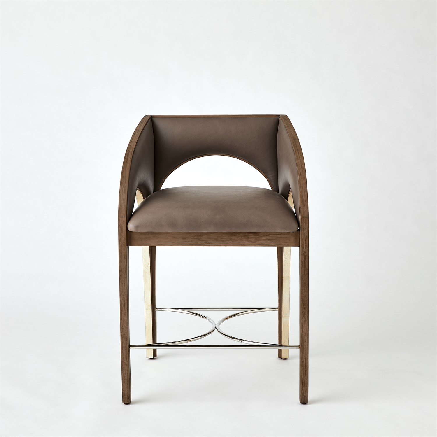 Our Arches Counter Stool is covered in luxurious leather and has a dyed eucalyptus veneer frame. The cool nutmeg tones perfectly contrast with the gold leaf accents on the base and the steel stretcher.