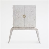 Our Baxter Bar Cabinet is form and function at it's finest. A solid wood case with expertly matched veneers, our signature white stained finish, and solid satin brass hardware make this unique design a head turner from first glance. Open up the doors to reveal 2 adjustable glass shelves, an eglomise mirrored back, three way touch light, two storage drawers, and a generous pull out tray for mixing the perfect cocktail at a moments notice.