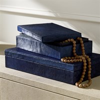 Simple in form but elegant in navy, the Blue Hair-on-Hide Boxes are covered in a deep blue hair-on-hide with a matching velvet interior. Due to natural dying process of the hair-on-hide, colors may vary from dark to a lighter blue color.