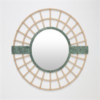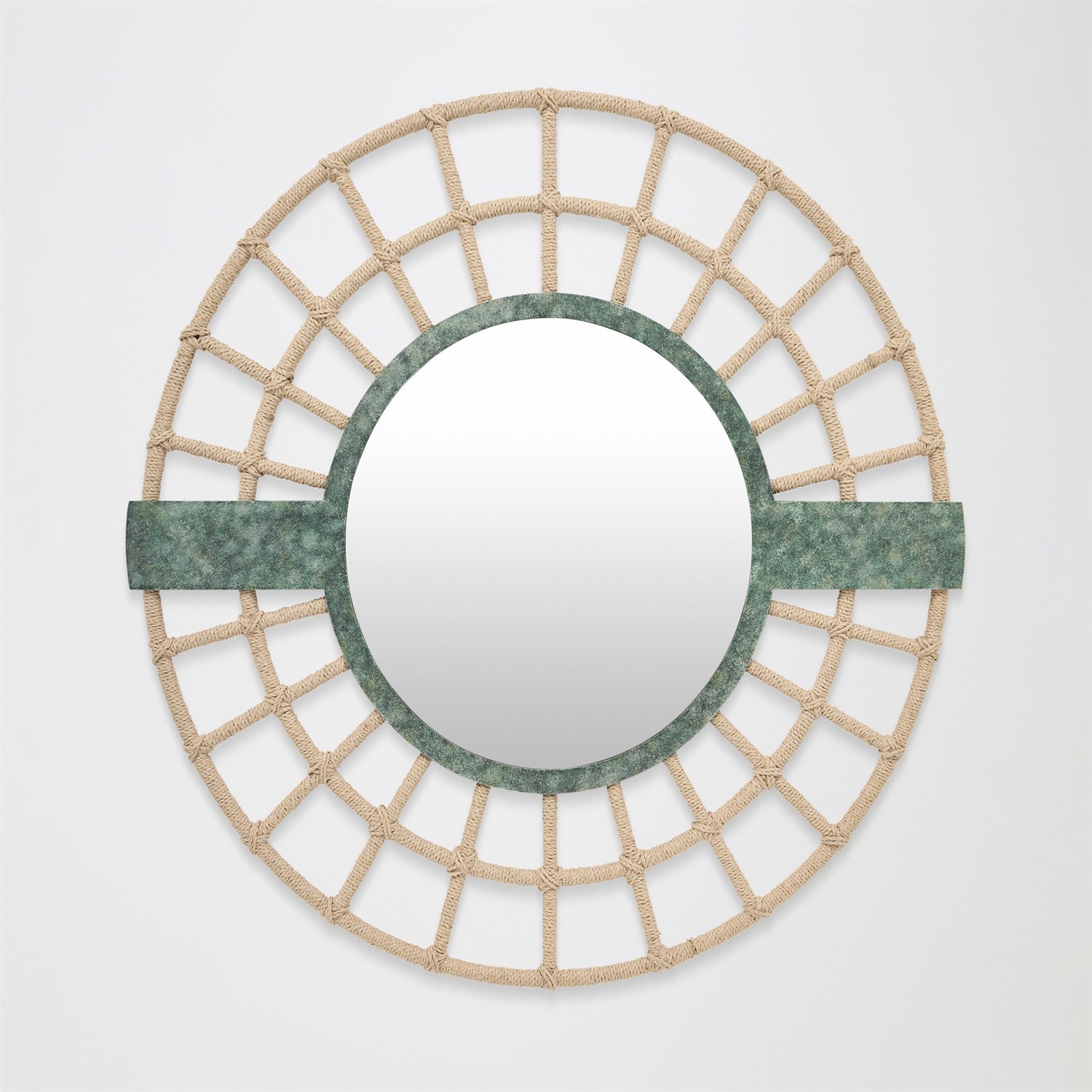 The Bouclier Mirror takes its name from the French word for "shield," recalling ancient emblems of protection and strength. Crafted from jute-wrapped iron with a verdigris finish, its circular frame radiates outward in a geometric web of structure and defense. The warrior knows: true protection comes not from what we hide behind, but from what we are willing to see.