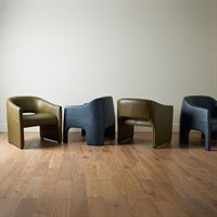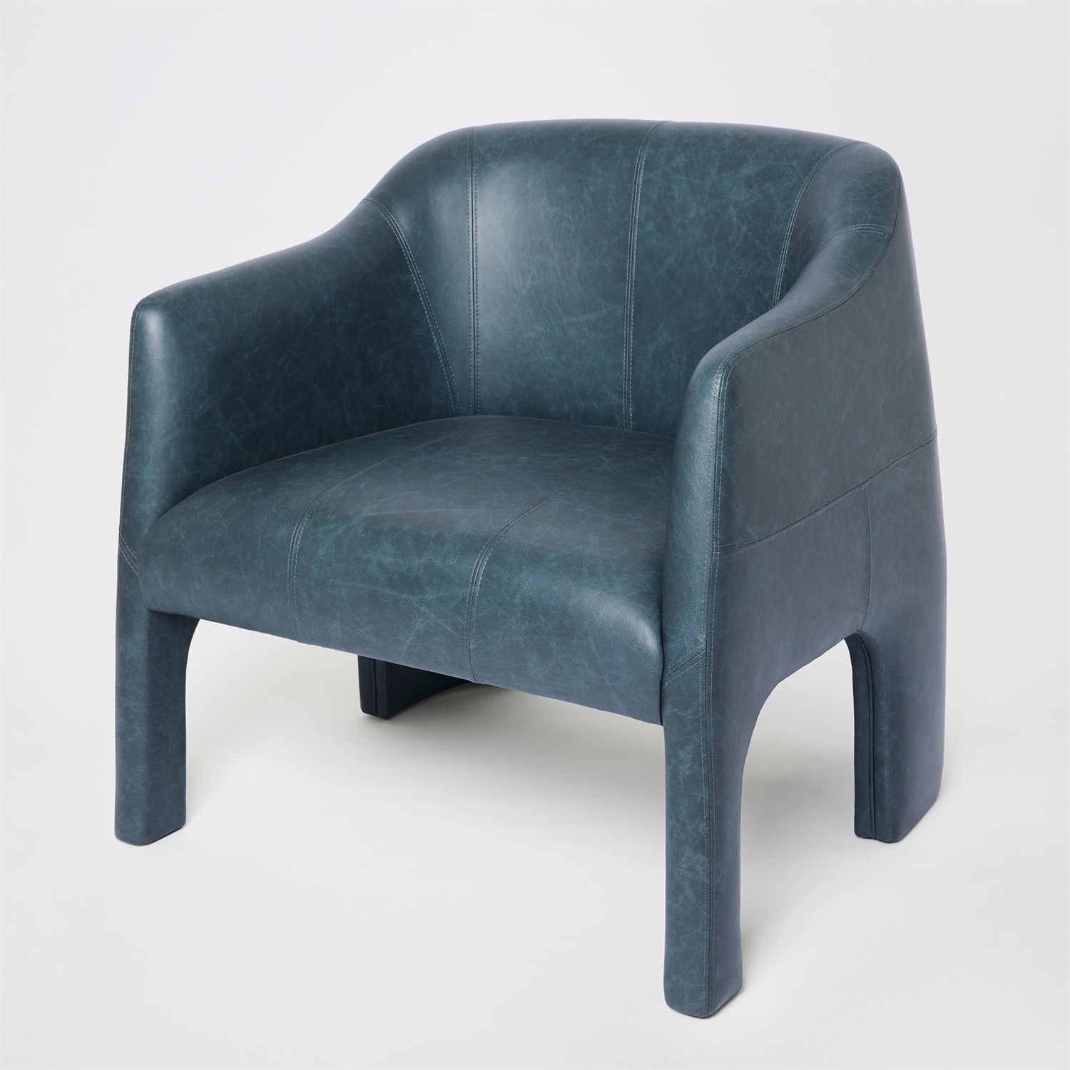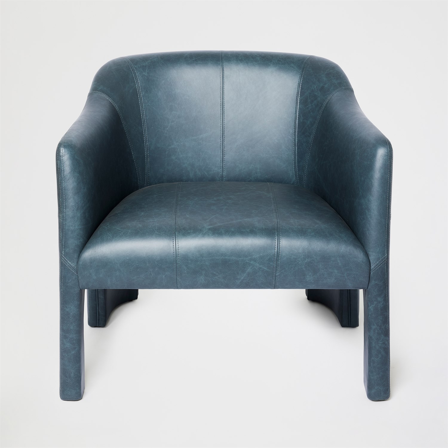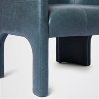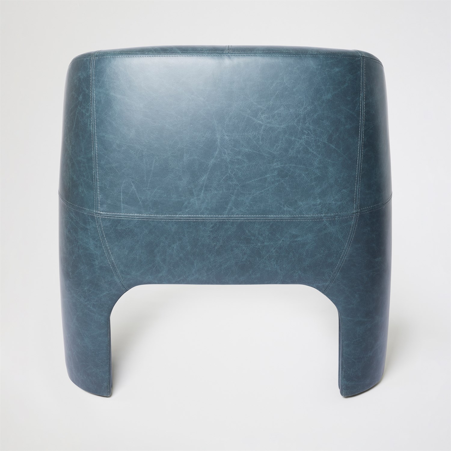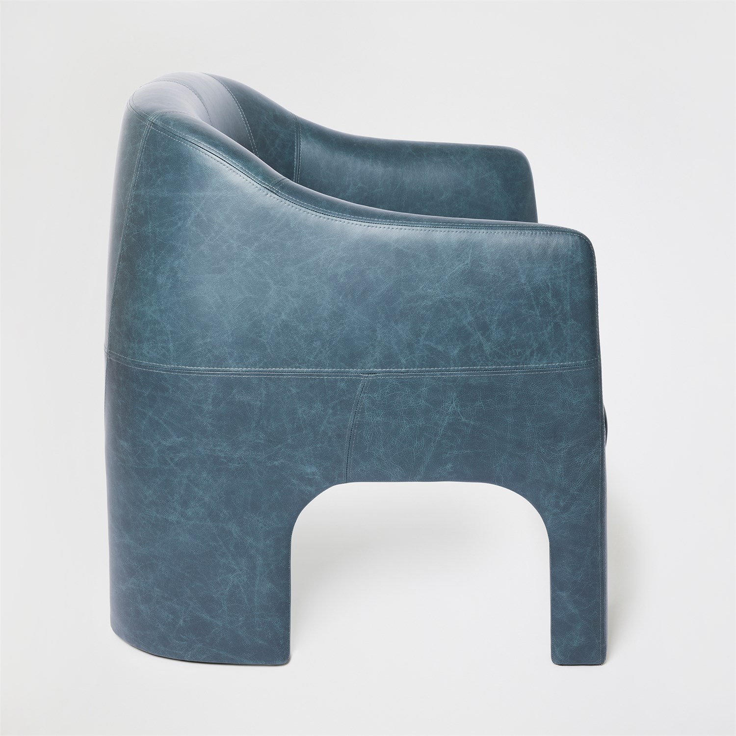 The unique curves and distinctive lines of the Bradford Chair come alive with distressed navy leather and architectural stitching. Its graceful form is an abstract nod to the majestic elephant, making the nature-inspired Bradford Chair a modern classic.