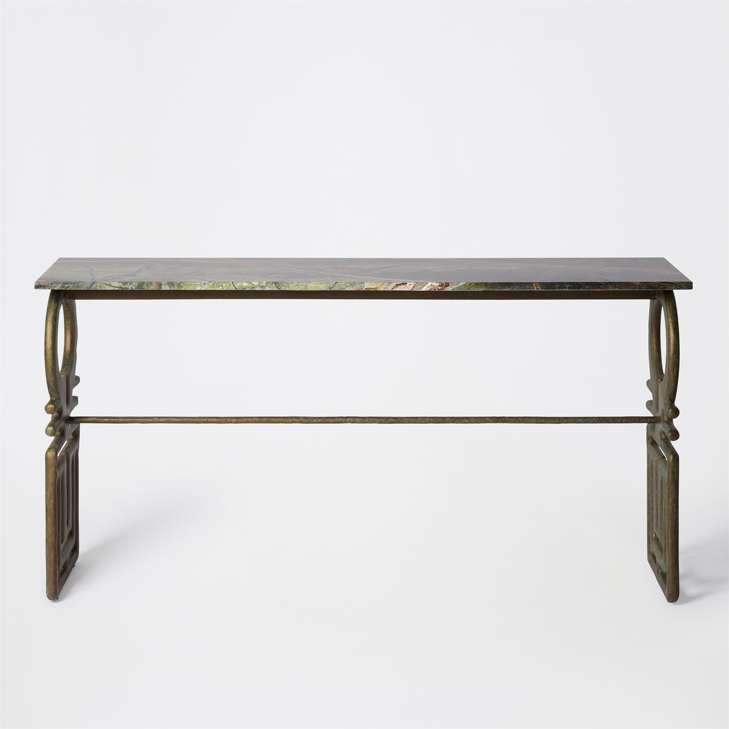 The Carthago Console transforms an ancient Roman key latch into a commanding architectural base. Scaled to modern proportions, its sculptural legs support a slab of rainforest green marble, where veins of deep emerald and rust trace the surface like ancient maps. Stone and metal. Precision and age. Carthago carries the grandeur of Roman craftsmanship into the present. The treasures we seek are often hidden in the ruins of what came before.