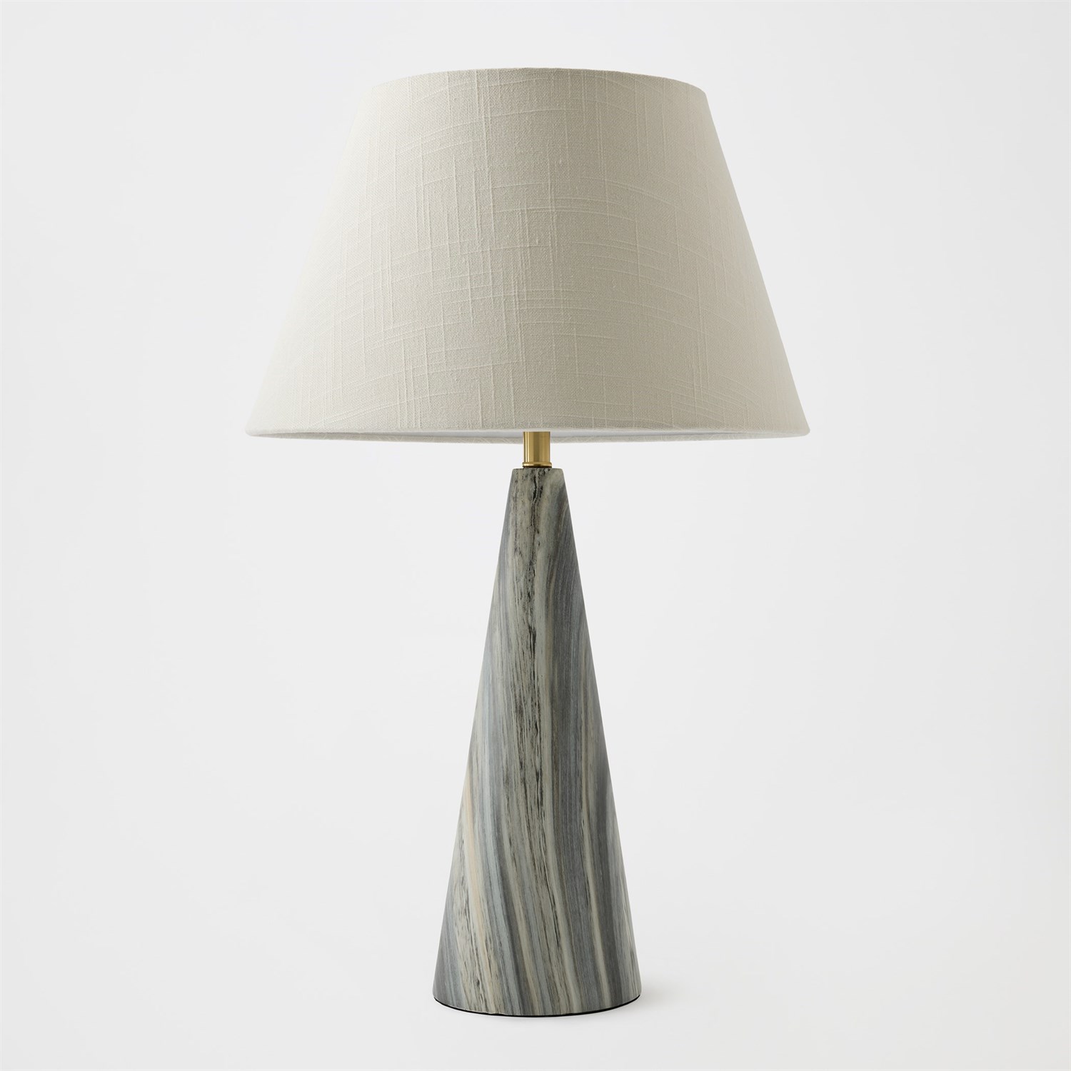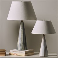 This modern conical shaped lamp is crafted from cast concrete and features a marbled water-transfer finish in earthy gray and green tones. Its minimalist silhouette and natural-inspired pattern combine to create a contemporary, sculptural lighting piece that adds both texture and elegance to any space. Available for purchase separately in large and small.