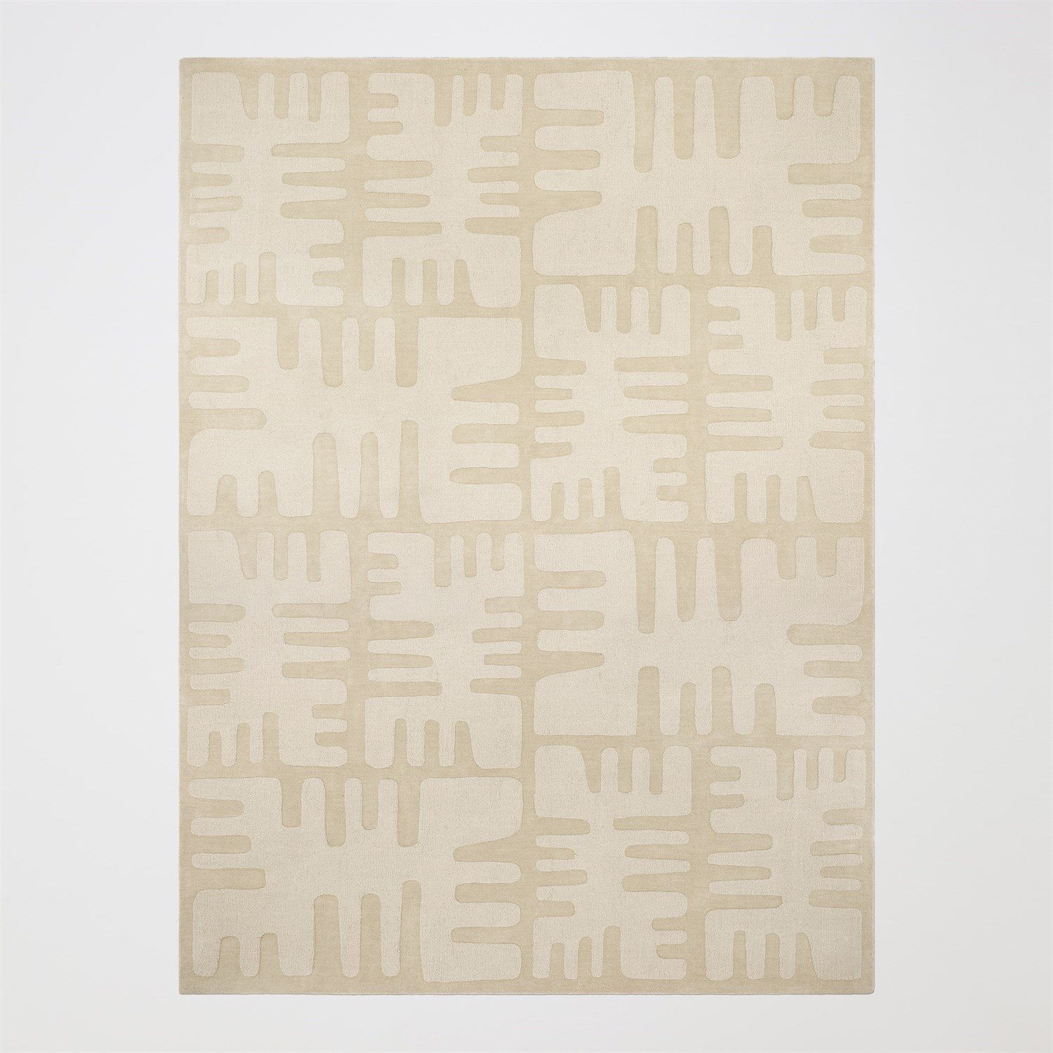 The Duafe Rugs translate the geometry of an ancient key latch into a field of texture and shadow. Hand-loomed in 100% wool with a 12mm pile, each rug combines looped and hand-carved cut piles for dimensional relief. The pattern - rhythmic and restrained - shifts gently as light moves across it. Offered in natural sand and earthen rust tones, the Duafe Rugs anchor a room in structure and craft. A path is made by walking it. What lies beneath our feet shapes where we go.