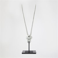 Finely detailed and masterfully cast in lost-wax iron, this Gemsbok Skull Sculpture showcases the grace and elegance of the animal in exquisite form. Finished in hand-painted matte white and mounted on a polished black granite base, the piece combines naturalistic detail with sophisticated materials, making it a striking statement of artistry and refinement.