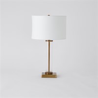 The Glass Tube Table Lamp combines a clean, linear design with durable borosilicate glass, set within a cast-aluminum and iron frame finished in antique brass. An off-white cotton hardback shade adds a soft, balanced illumination to the look.