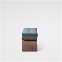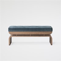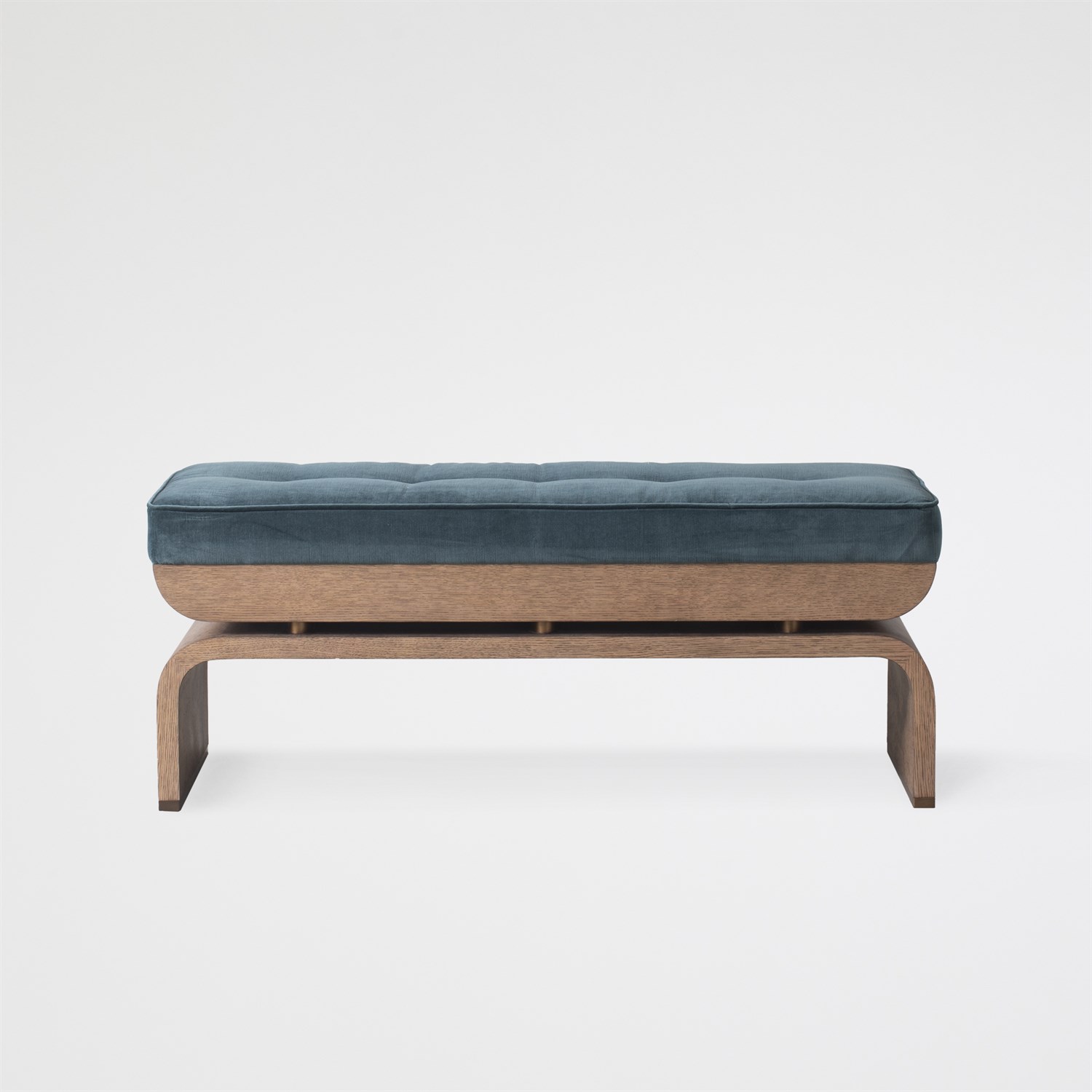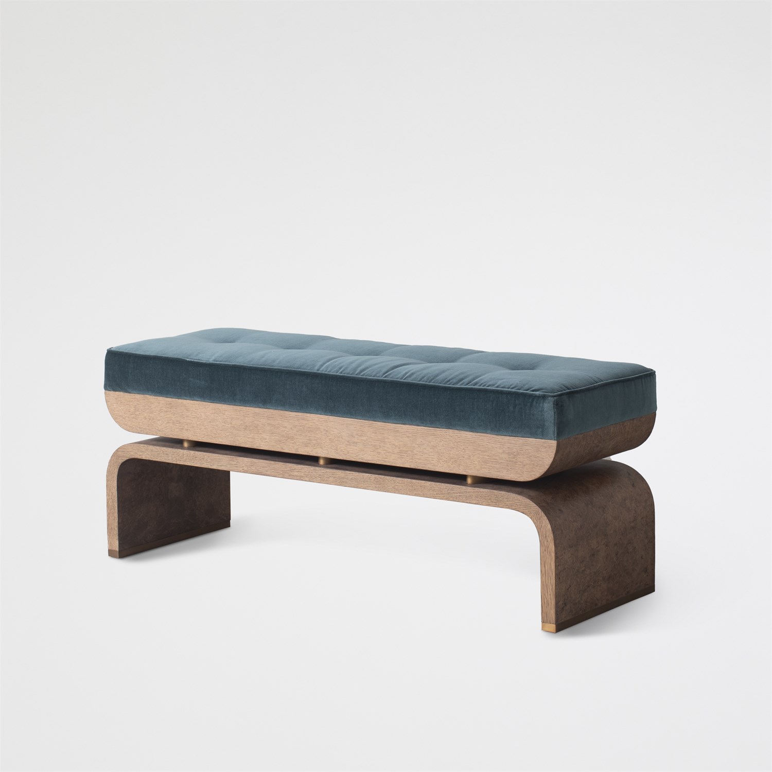 The Ives Bench was inspired by the veneered waterfall collections of the Art Deco period streamlined into contemporary silhouettes. Constructed of burled and straight grain oak veneers, stainless steel with a bronze finish and rich cotton velvet fabric. Also available in muslin.