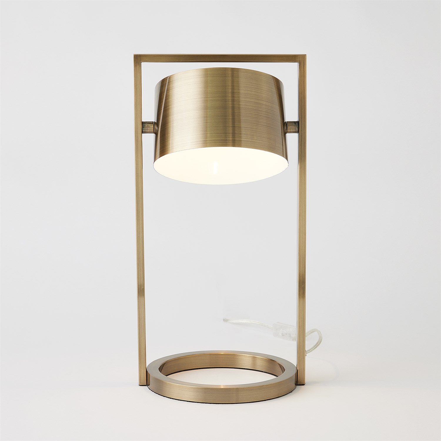 Streamlined and refined, the Key Light Metal Table Lamp is crafted from iron with an antique brass finish. Its pivoting shade provides adjustable lighting, and a white interior enhances the glow. Subtle detailing and clean lines define its sleek, purposeful design.