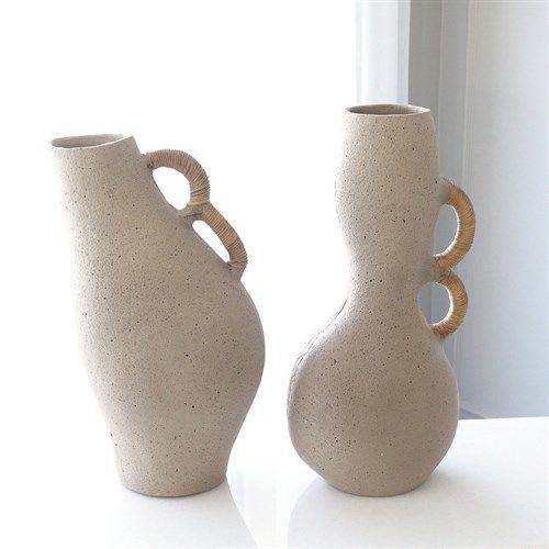 Our Leaning Vase is made of Ecomix and has rattan wrapped handles.