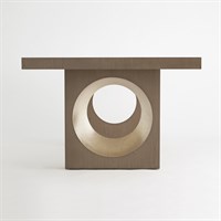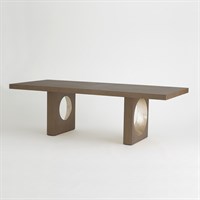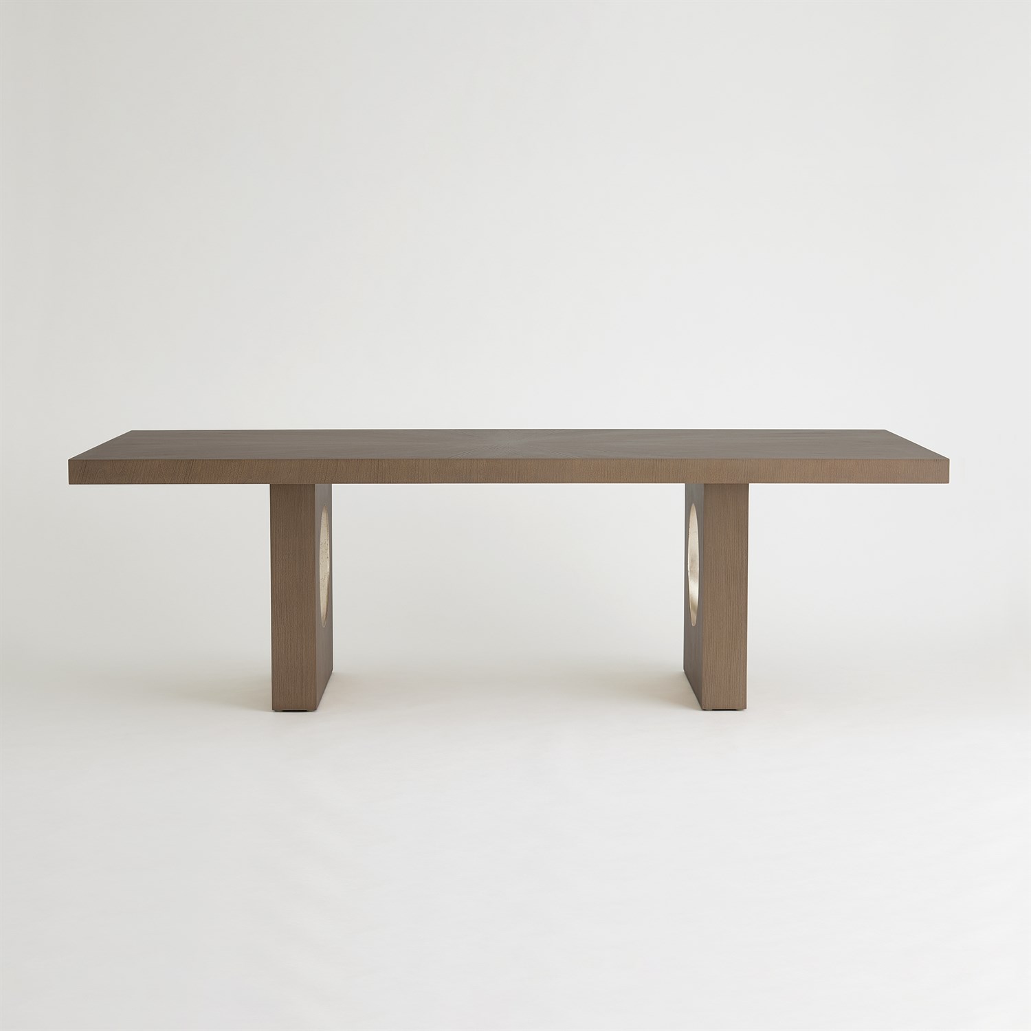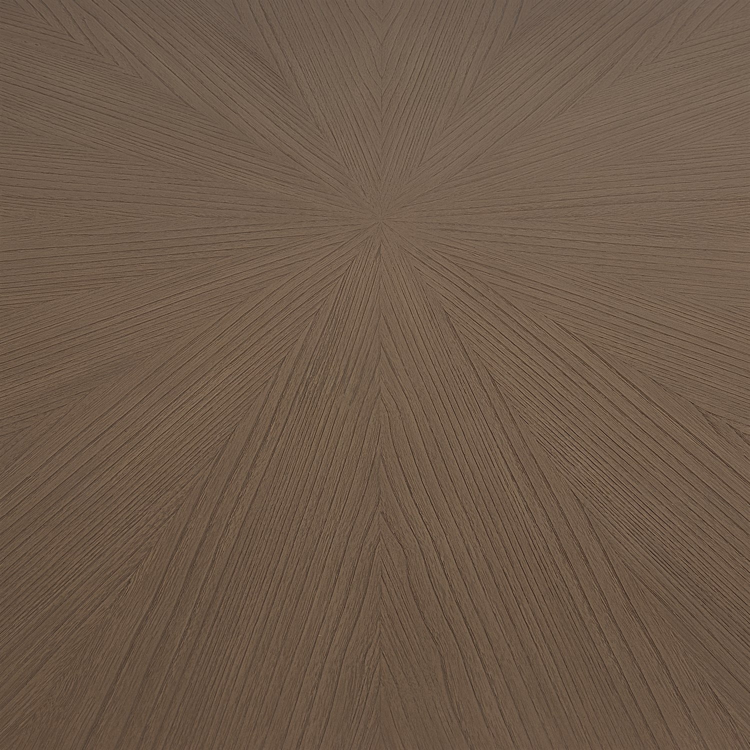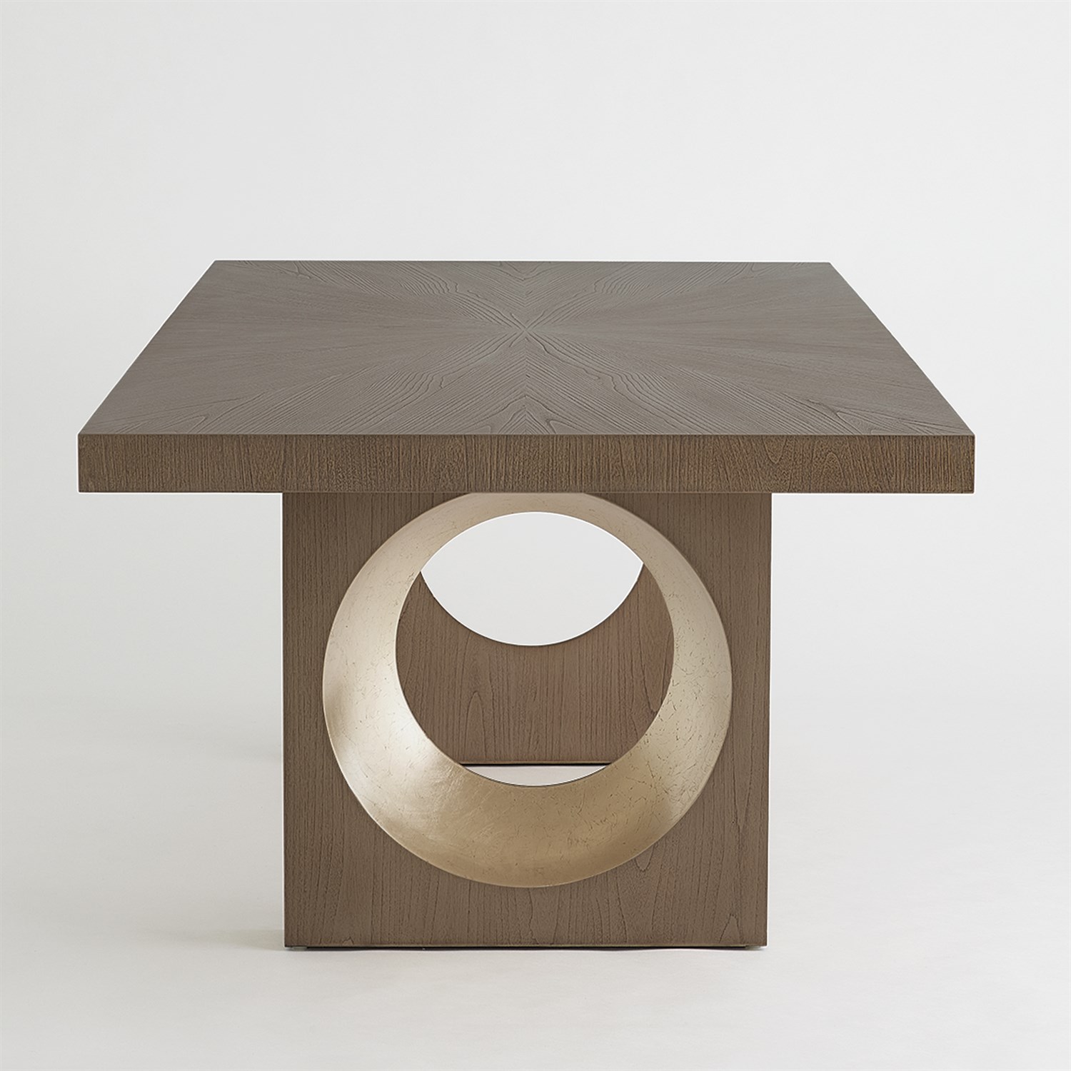 Handcrafted from luxurious mahogany with a nutmeg finish, the Oculus Dining Table exudes contemporary elegance with its sleek design and captivating burst pattern. Enhanced with champagne-toned gold leaf accents, it adds a touch of sophistication to any dining space.
