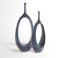 These dramatic silhouettes are extremely difficult to achieve on this scale, but the results are stunning. The height, proportion, and negative space of the ring vases lend to the overall impact of these unique pieces. The celestial color, a rich dark teal / greenish navy tone, is achieved with a multi dimensional reactive glaze.