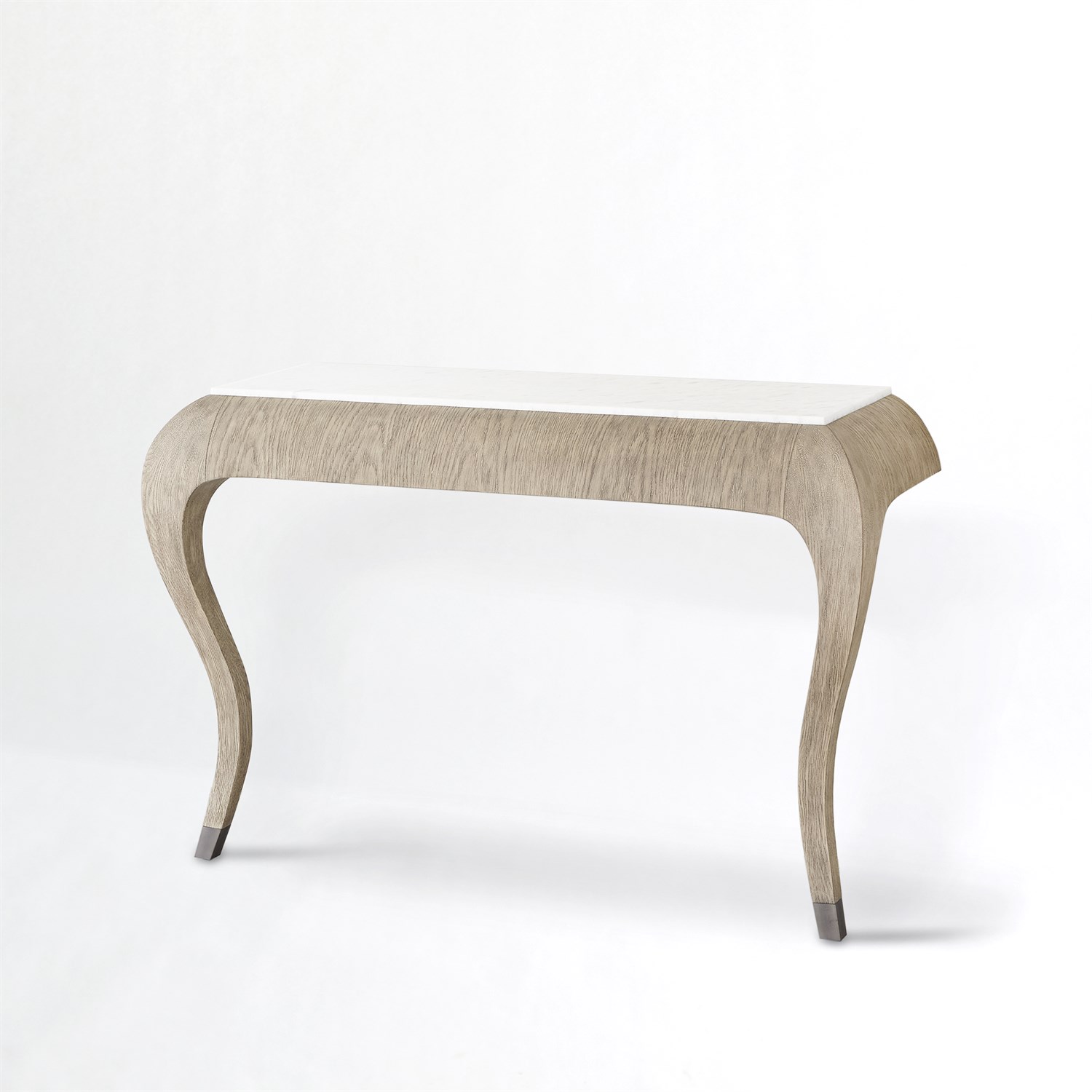 Inspired by the silhouettes of 1930's French cabinetmakers, The Paris Wall Console is made of grey sandblasted oak and has elegantly curved legs with protective cast aluminum feet. Also available in black cerused oak.