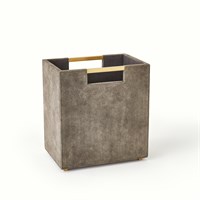 The Posh Wastebasket is luxuriously wrapped in grey suede leather blending practicality with sophistication in your living space. It features antiqued brass-finished handles and microsuede in the interior.