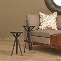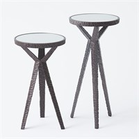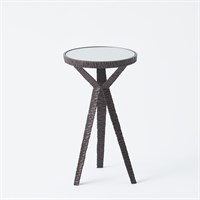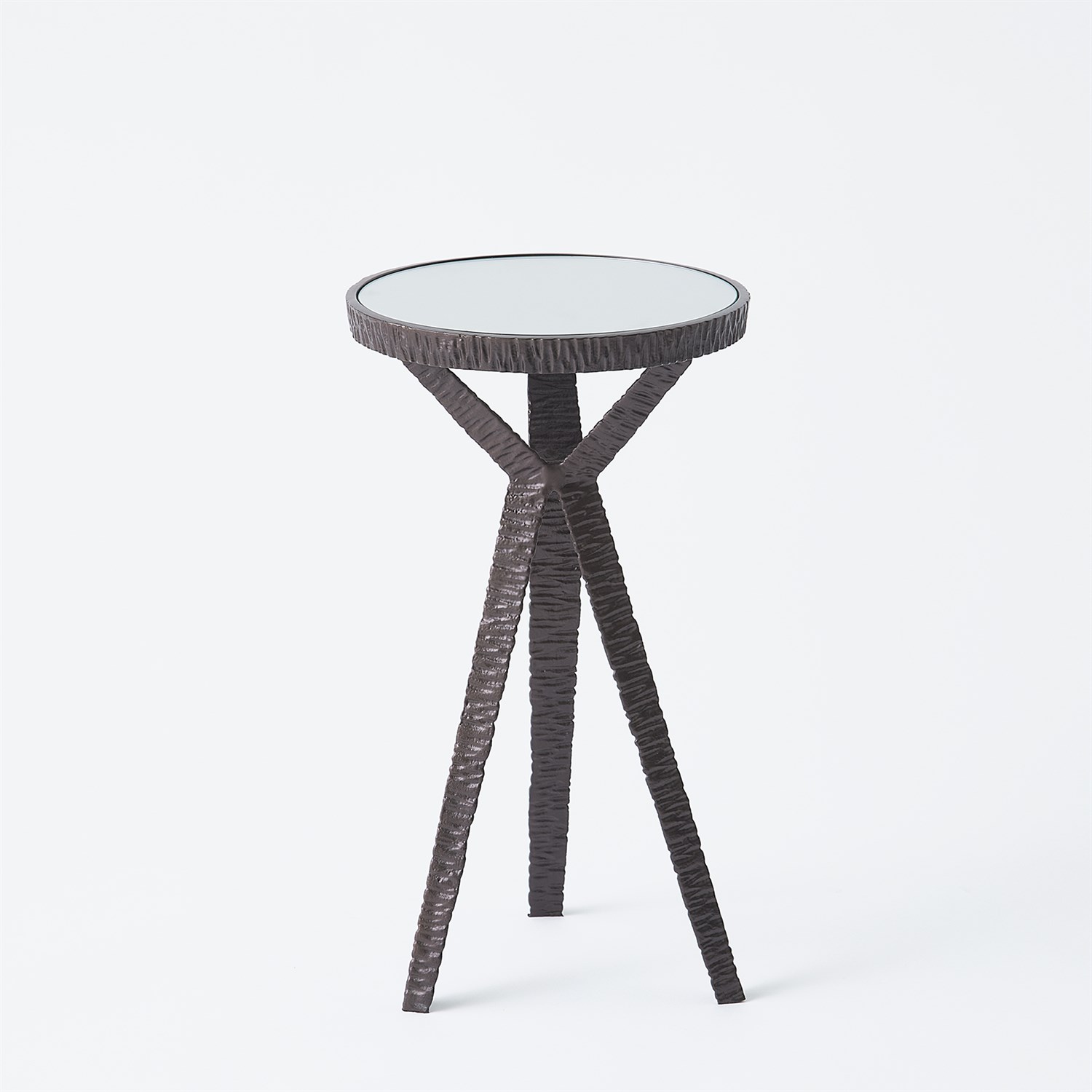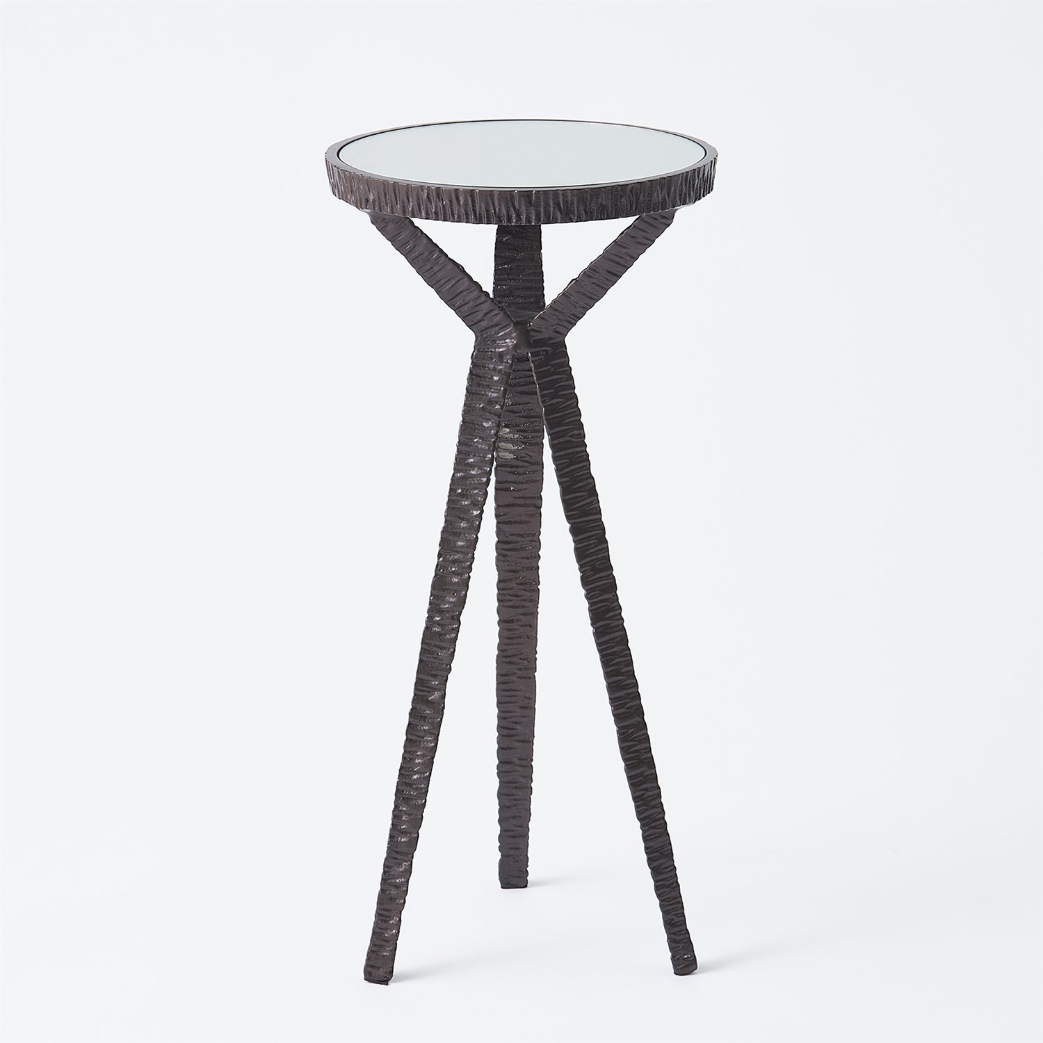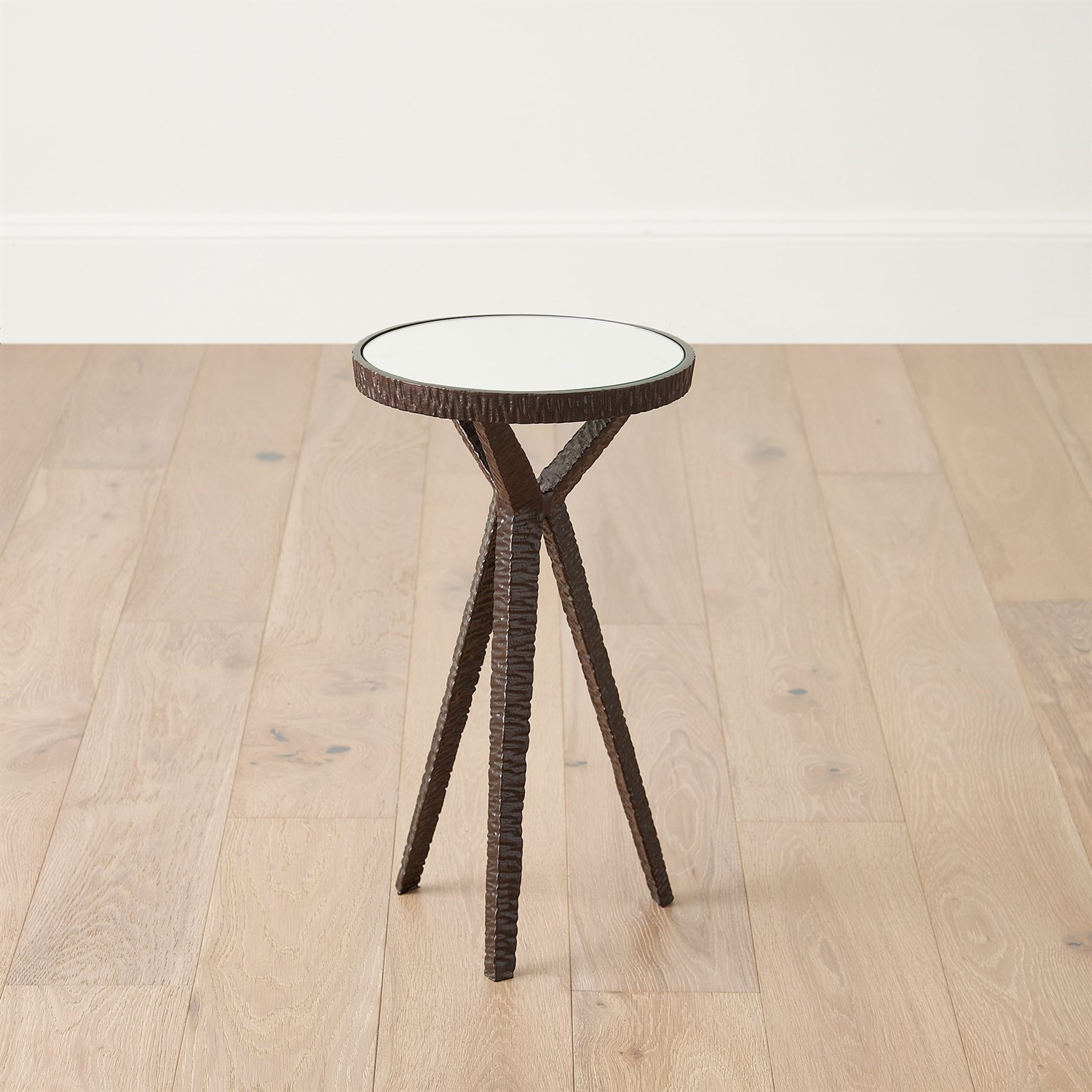 The Round Drinks Table features a textured iron base with an antique bronze finish paired with a sleek mirrored surface. Its tripod design provides a sculptural element, balancing strength and simplicity in a compact form.