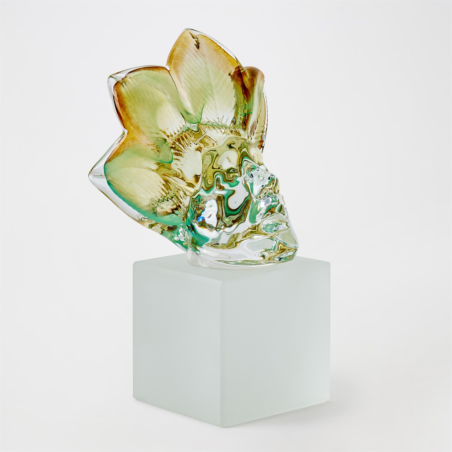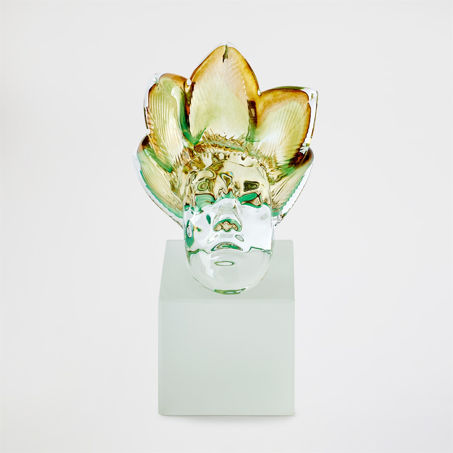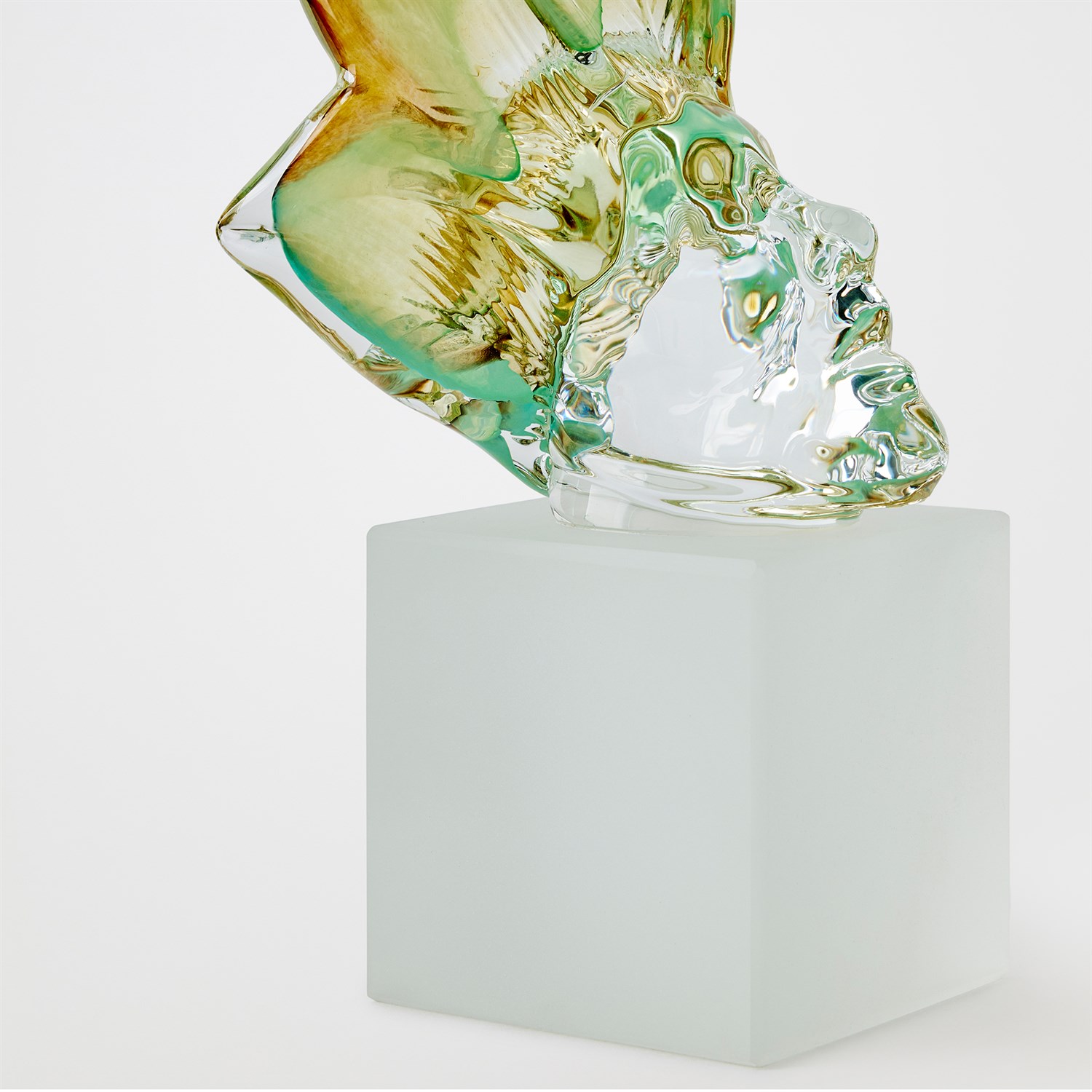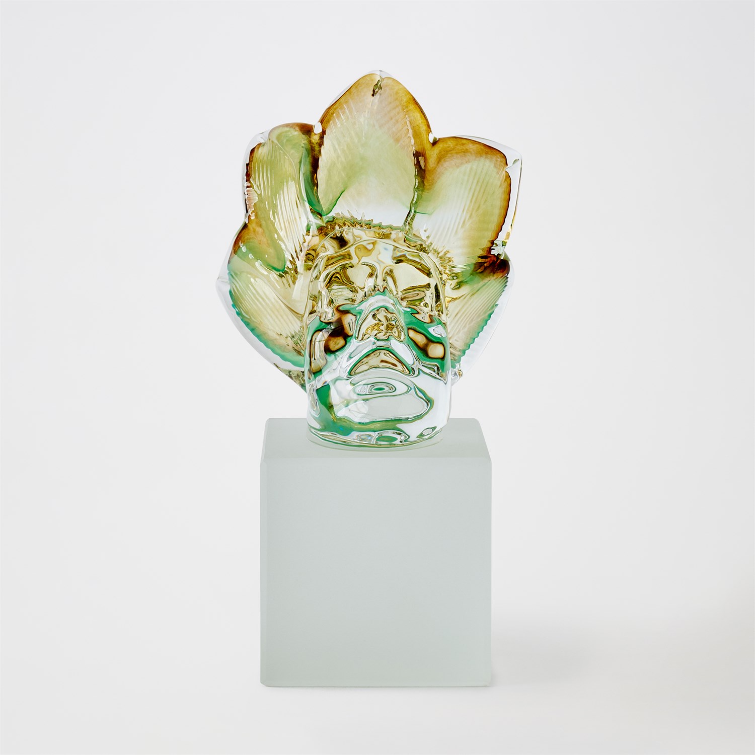 Polish artisans expertly hand sculpt this fantastic Royal Portrait featuring a leaf or scallop crown in pistacio and amber resting gracefully upon a clear glass bust positioned on a frosted glass block. The Royal Portrait exudes timeless sophisitcation with its harmoneous color, texture, and form that elevates any collection