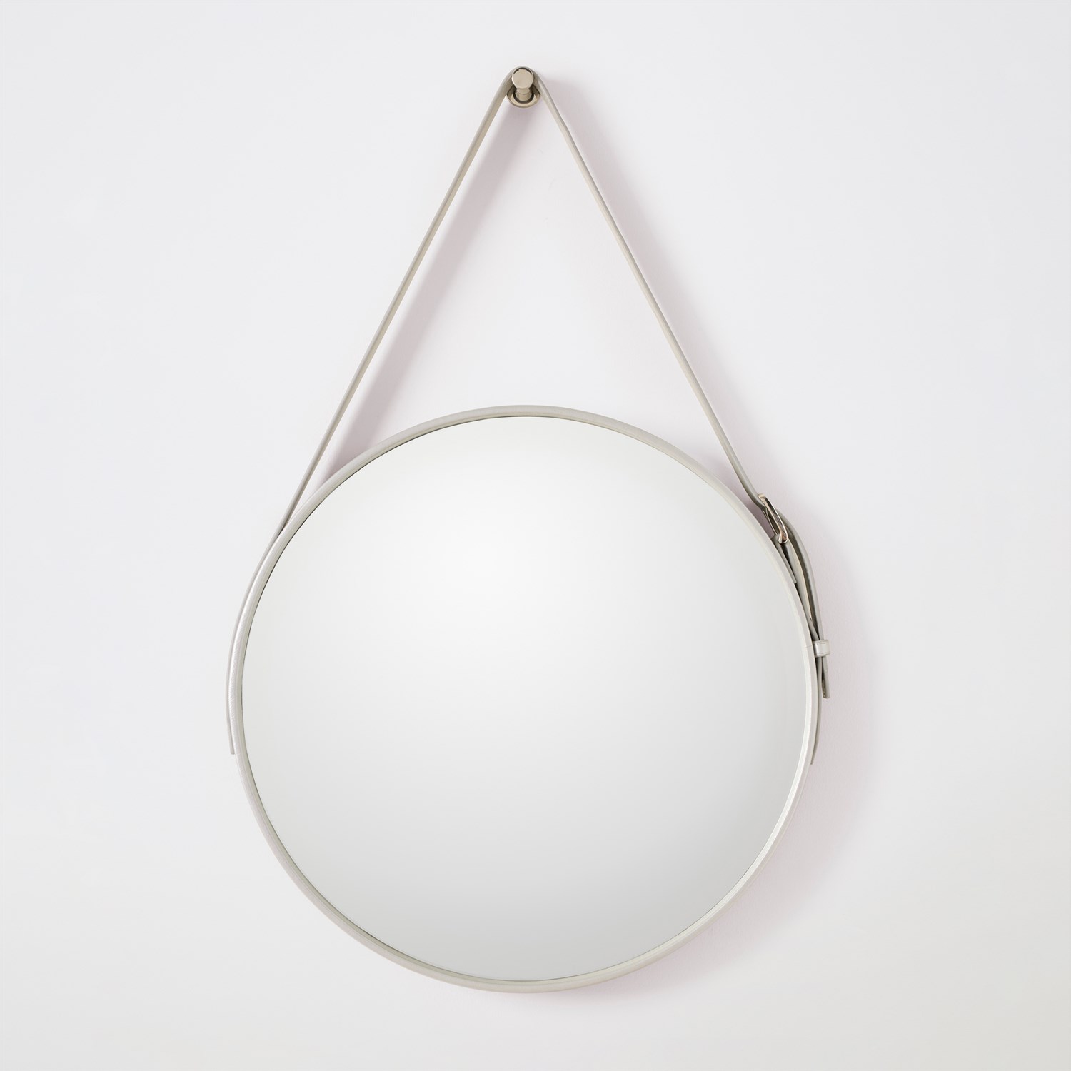 The Saddle Mirror is elegantly upholstered in silver-tone leather, combining refined materials with sculptural design. It hangs securely via a French cleat, while a buckled leather strap, mounted on a brushed brass peg, evokes the look of a suspended hanging strap. The result is a sophisticated, artful statement that elevates any interior.