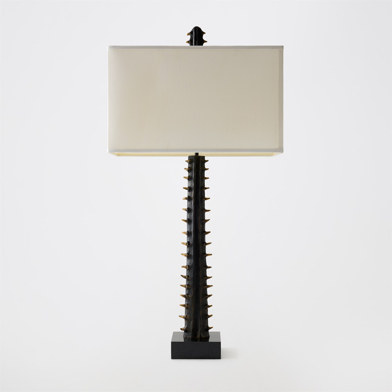 The Saw Tooth Table Lamp is finely detailed and crafted in cast iron with a hand-painted bronze finish, resting on a polished black granite base. Its sculptural design combines intricate craftsmanship with functional elegance, creating a sophisticated accent for any interior.