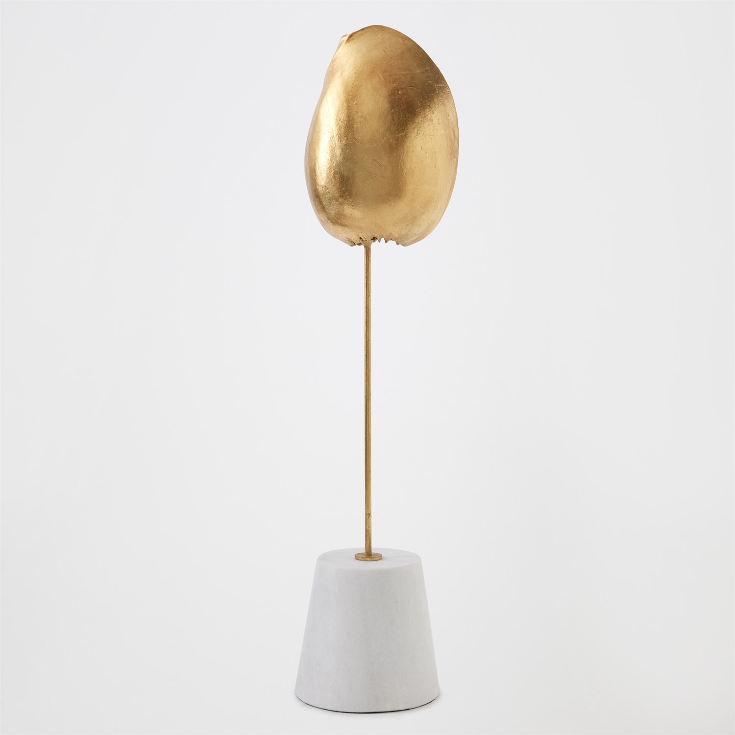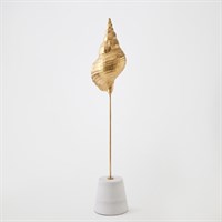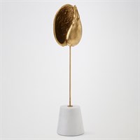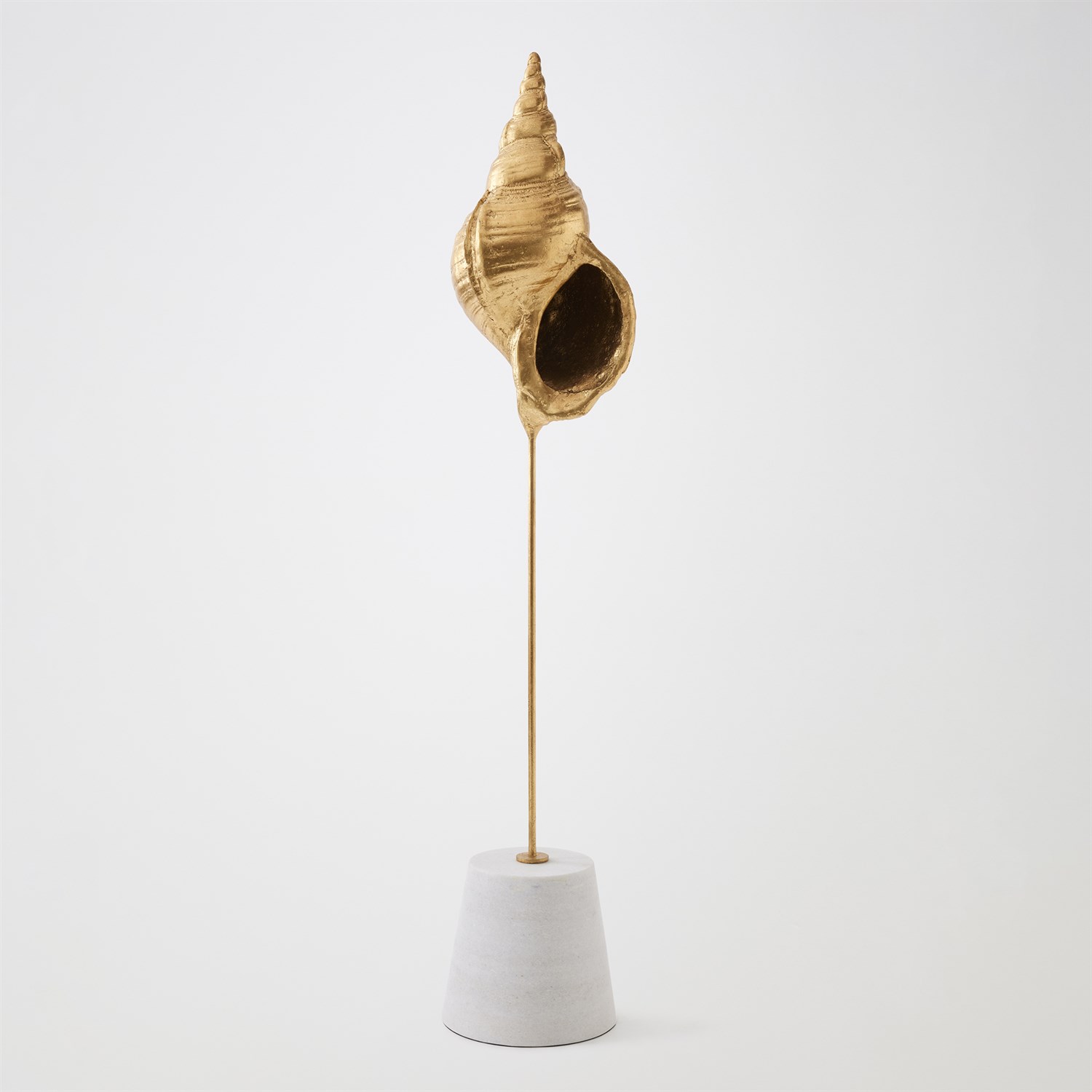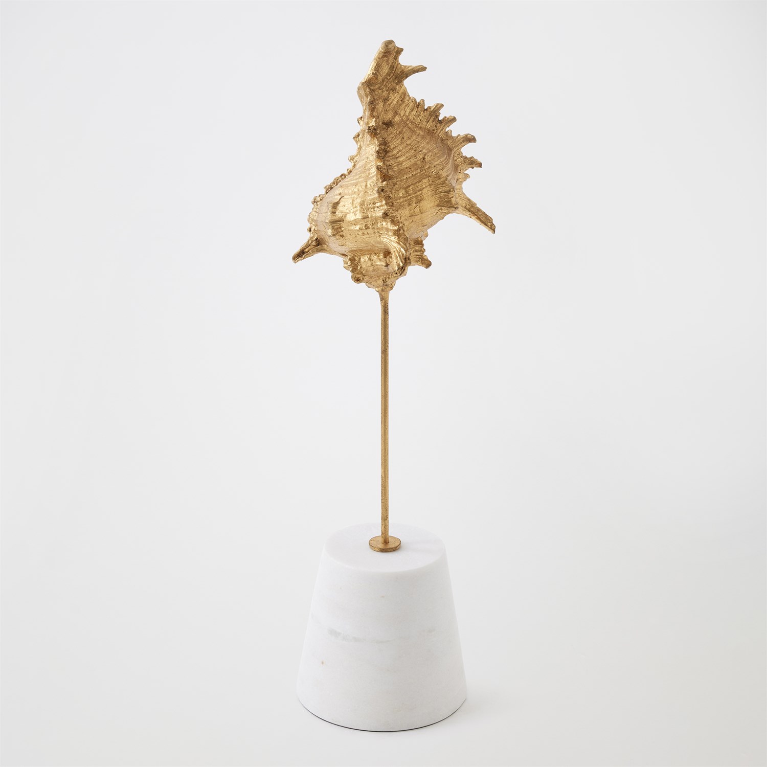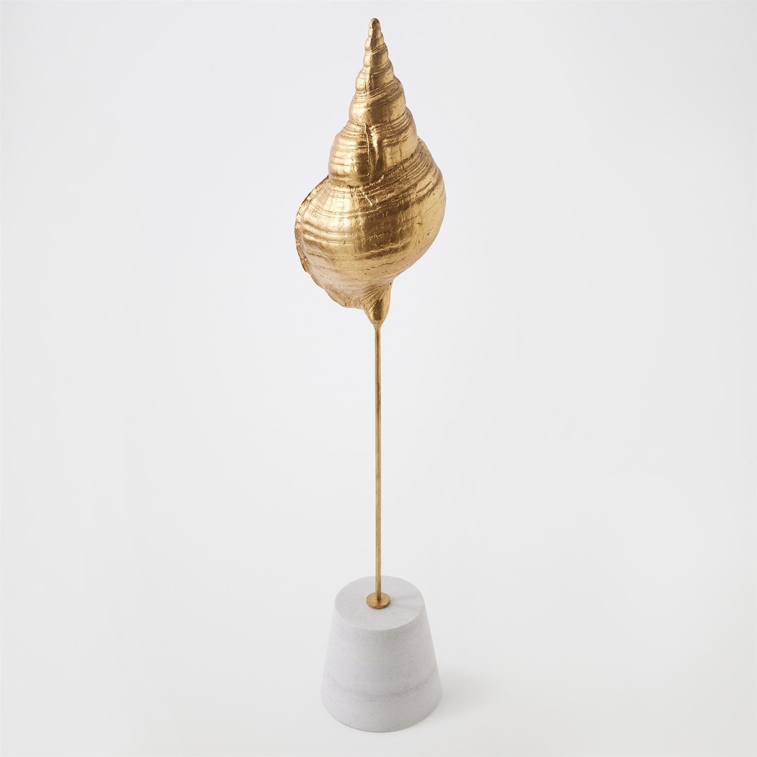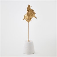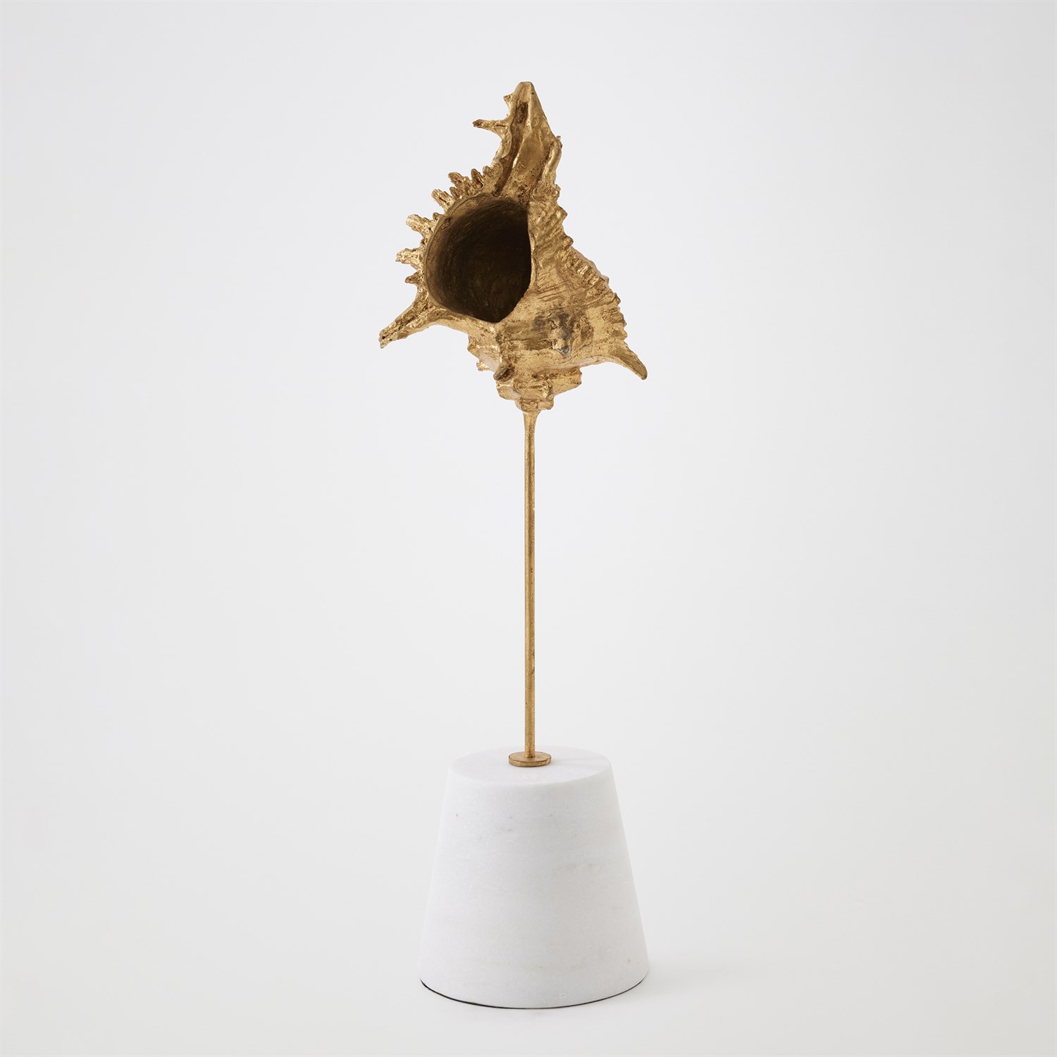 Finely detailed and sculpted in lost-wax cast iron, this exquisite sea shell is finished in gold leaf, evoking the opulence of ocean treasures. Museum-mounted on a honed white marble conical base, the piece pairs natural inspiration with refined artistry — a striking fusion of form, texture, and elegance. Available in large, medium, and small with three unique sea shell shapes.