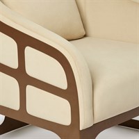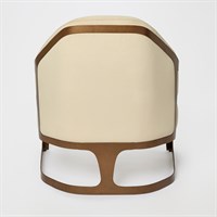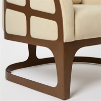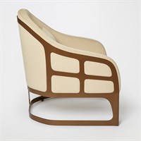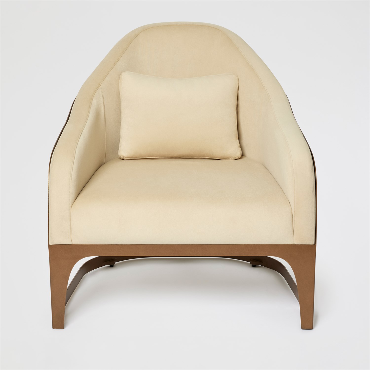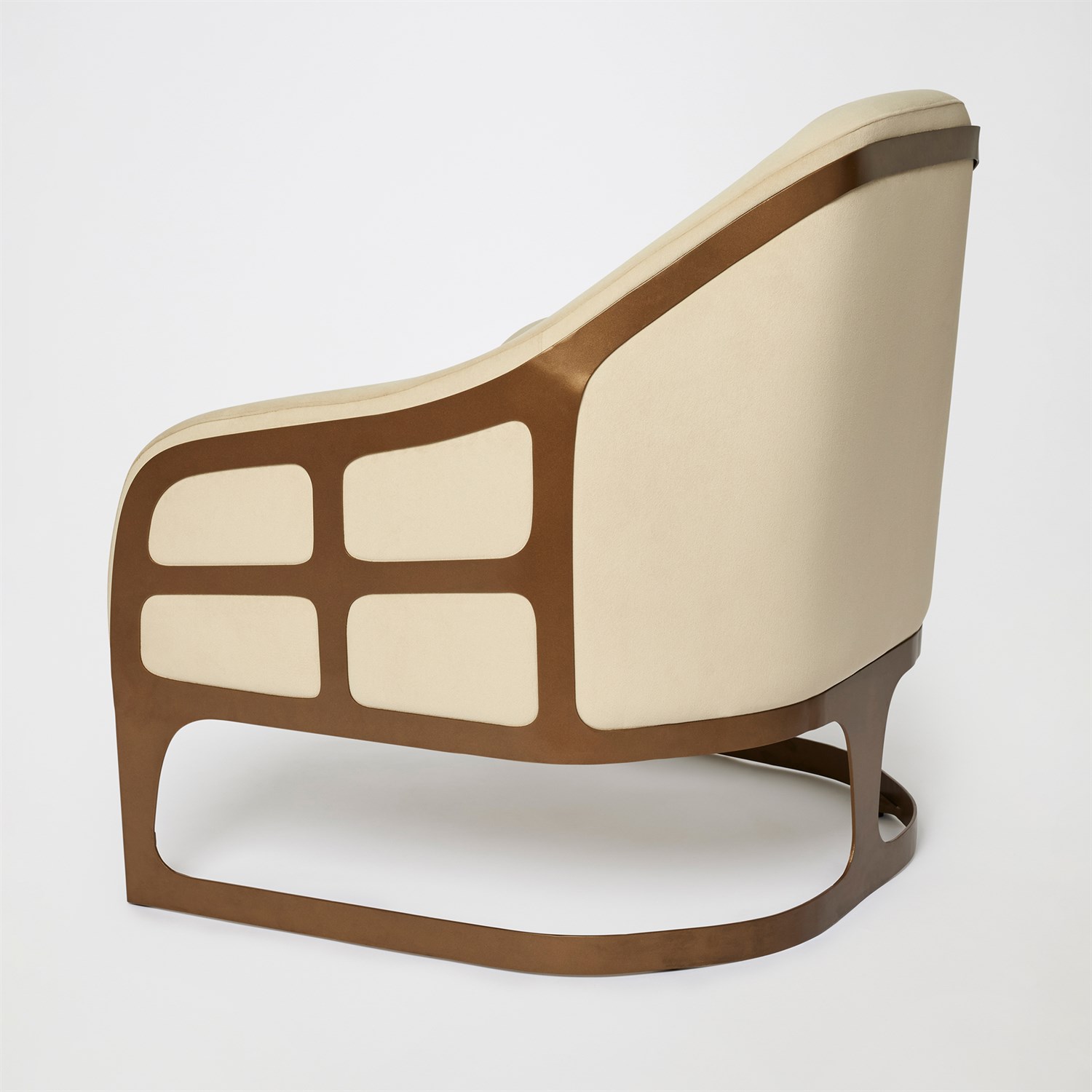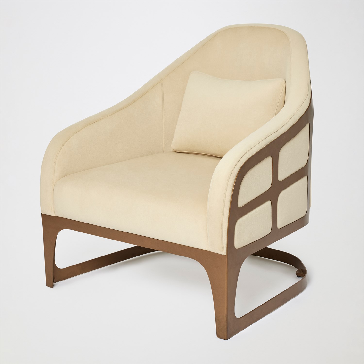 The Soho Chair offers tailored, sensual elegance in this surprising three-legged, sculptural work. Deep bronze metal embraces soft cream fabric with its curved architectural framing - an inviting balance between structural sophistication and cozy comfort.