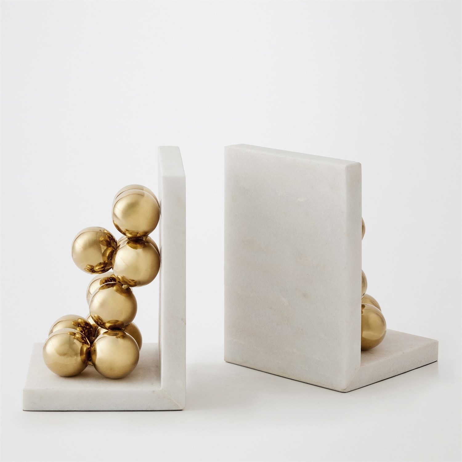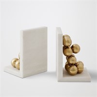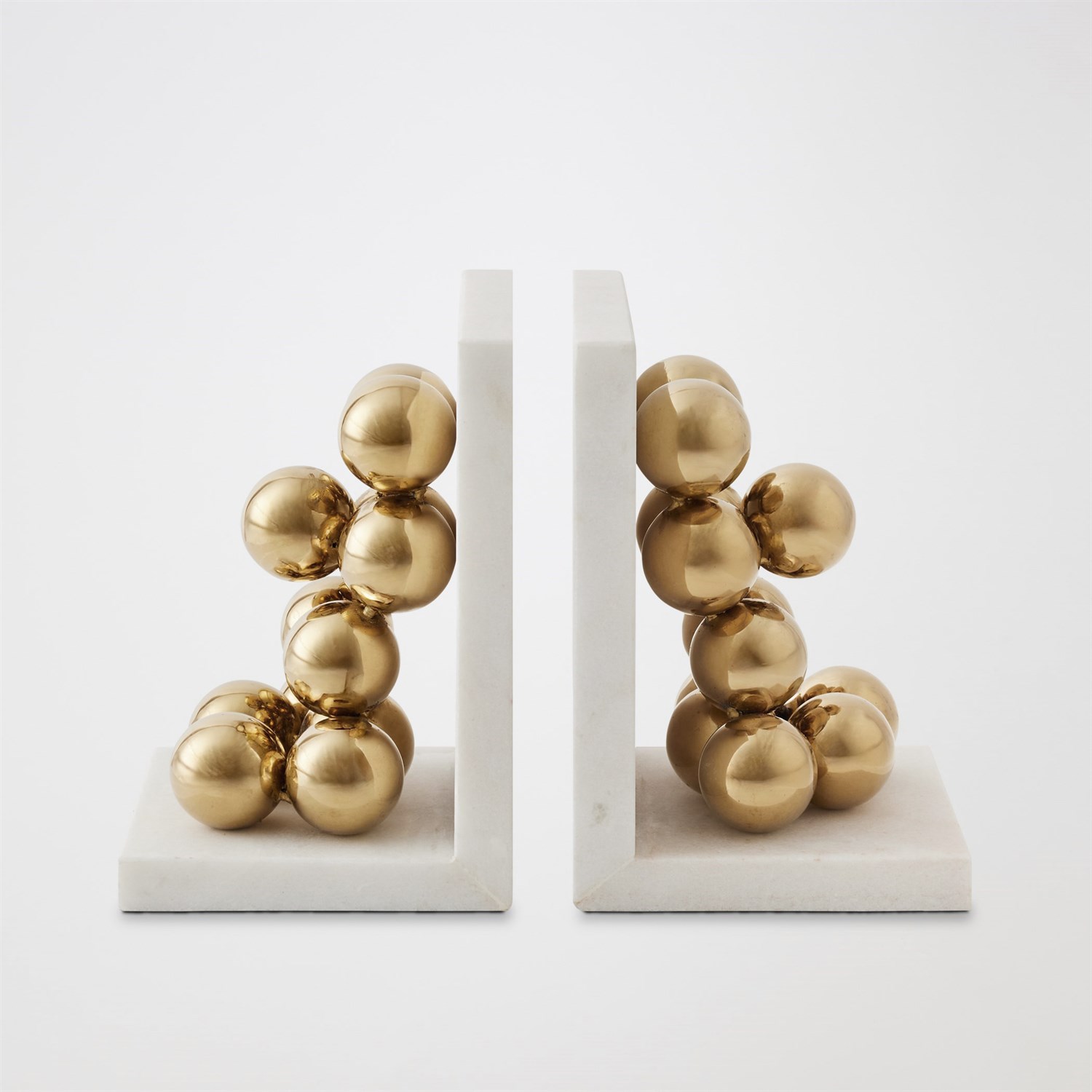 The Sphere Bookends feature a modern, stacked-sphere design, expertly crafted in spun steel with a plated brass finish. Mounted on white marble bases, they blend sculptural form with functional elegance, bringing a refined, contemporary touch to any bookshelf or workspace.