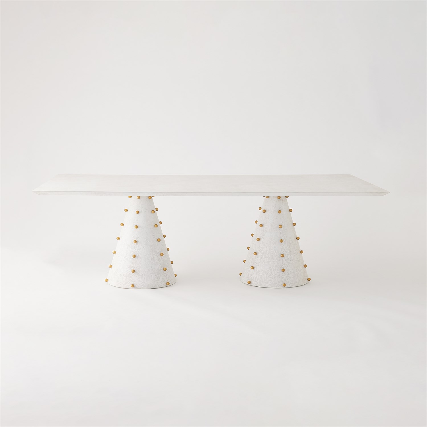 Drawing from her love of modern forms and chic material mixes, Ashley Childers designed the Spheres Rectangle Dining Table to meld modern design with impeccable craftsmanship. Each table features hand-matched veneers in a white burl finish. Hand cast brass ball details on the base finish off the unexpected and playful design.