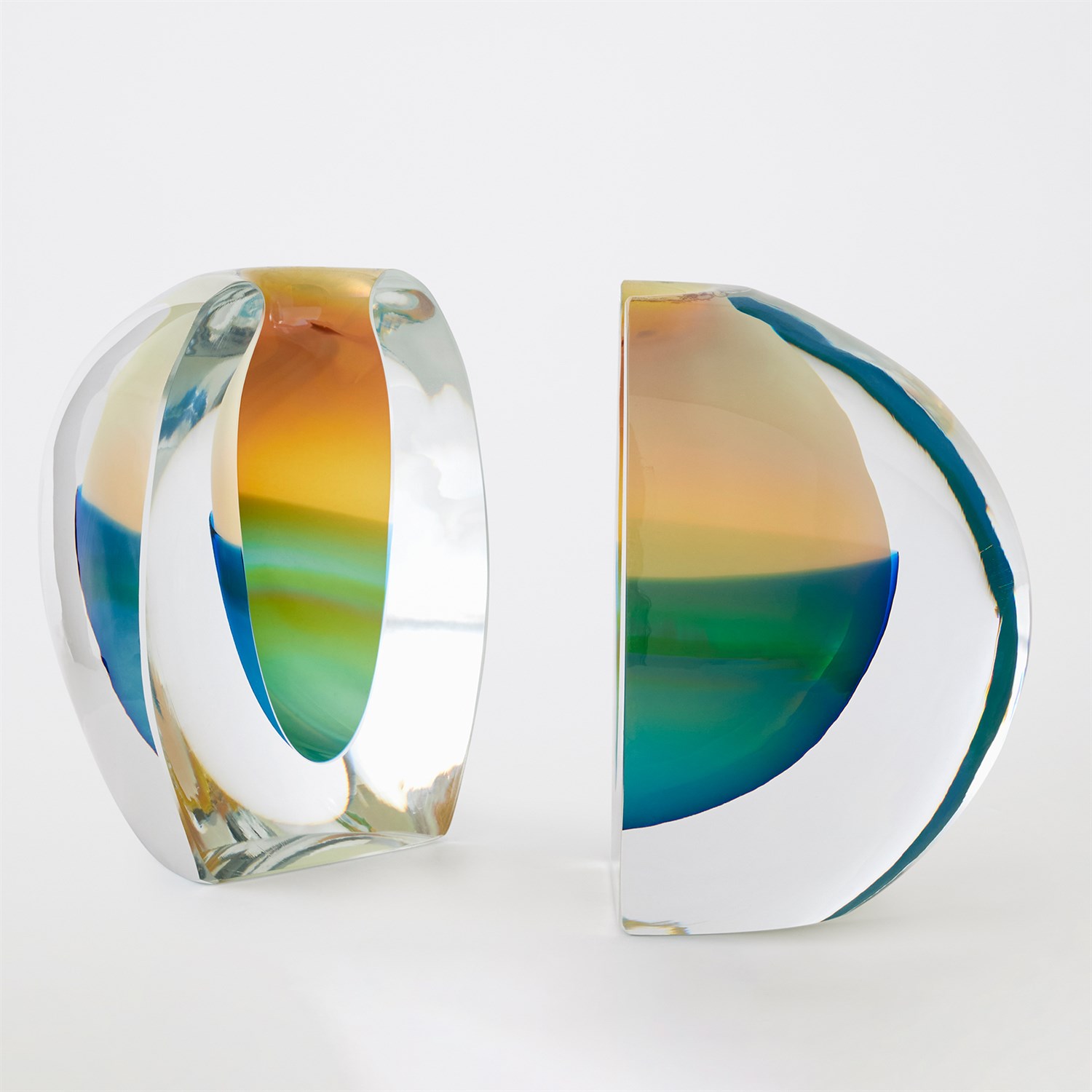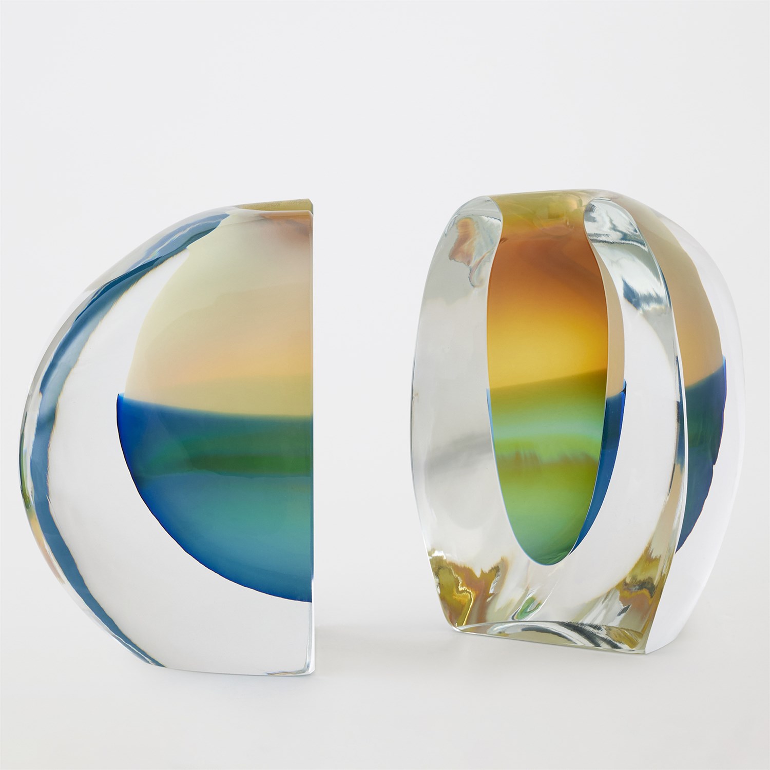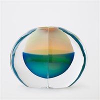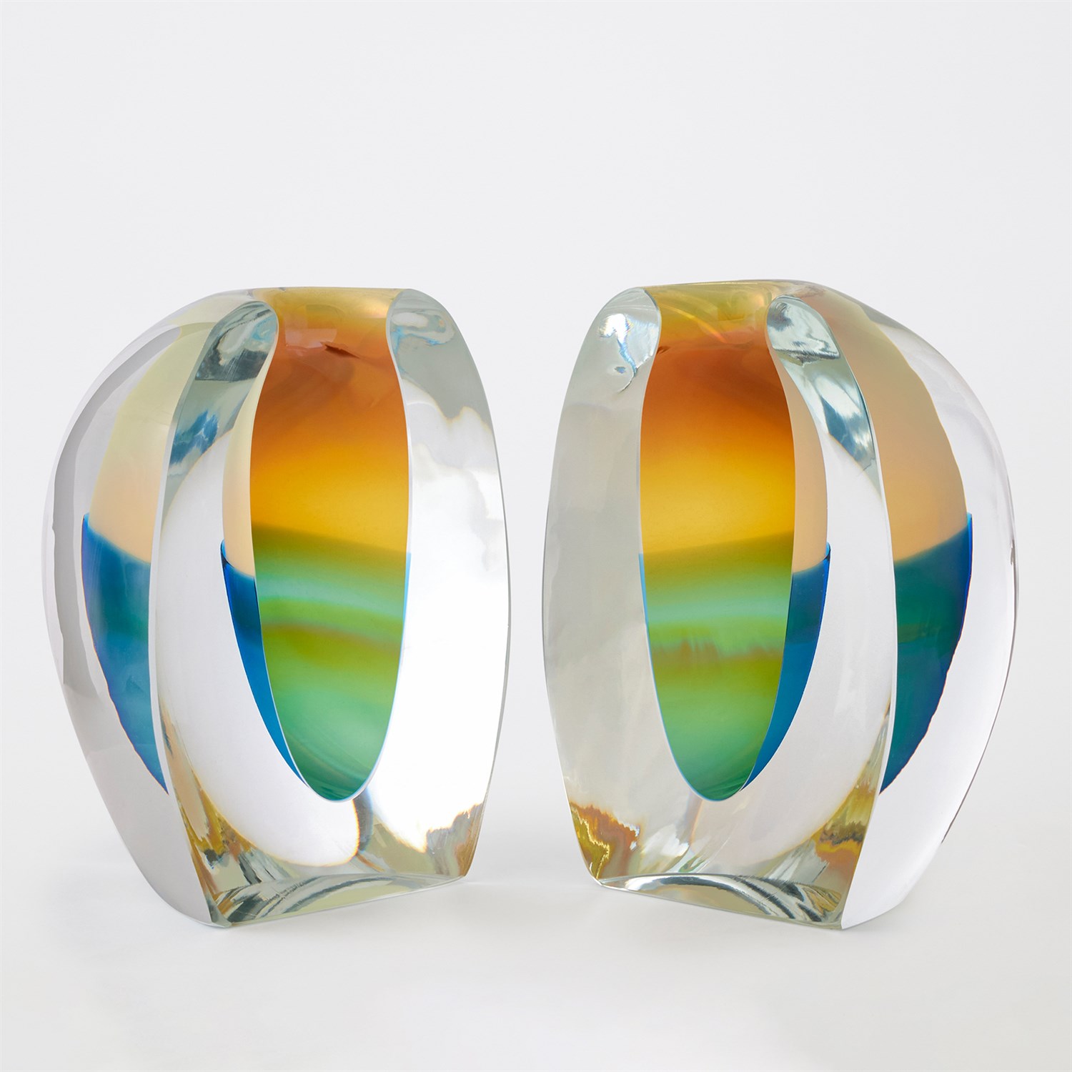 The Split Vase Bookends embody the poetry of duality—two become one, one becomes two. Mouth-blown in Poland, each art glass piece captures a mesmerizing blend of Iris gelp and blue hues. When completed, the bookends are “split,” revealing a captivating interplay of light and color that celebrates the mastery of Polish glassmaking. Also available in sophisticated topaz and blue tones, these bookends transform functional design into an artistic statement.