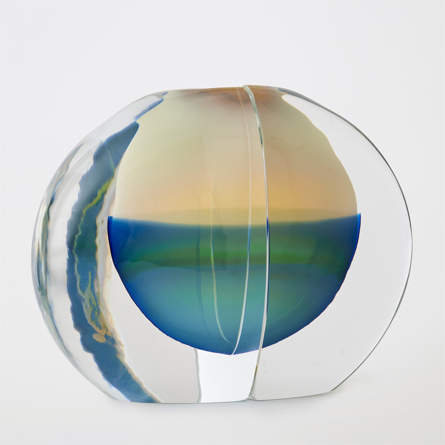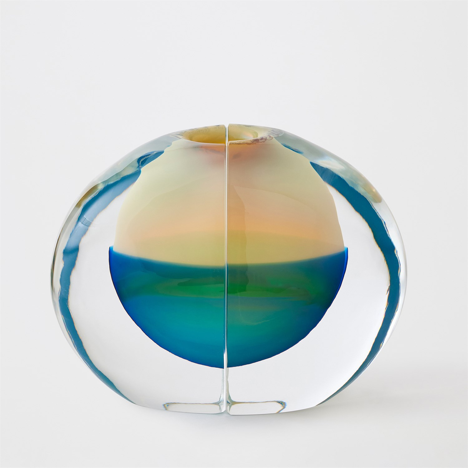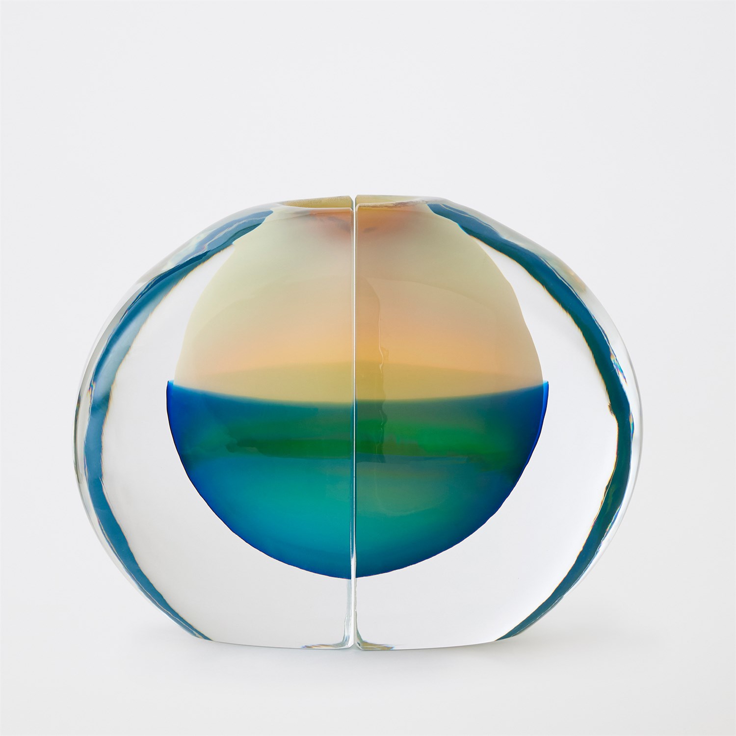 The Split Vase Bookends embody the poetry of duality—two become one, one becomes two. Mouth-blown in Poland, each art glass piece captures a mesmerizing blend of Iris gelp and blue hues. When completed, the bookends are “split,” revealing a captivating interplay of light and color that celebrates the mastery of Polish glassmaking. Also available in sophisticated topaz and blue tones, these bookends transform functional design into an artistic statement.