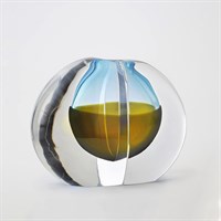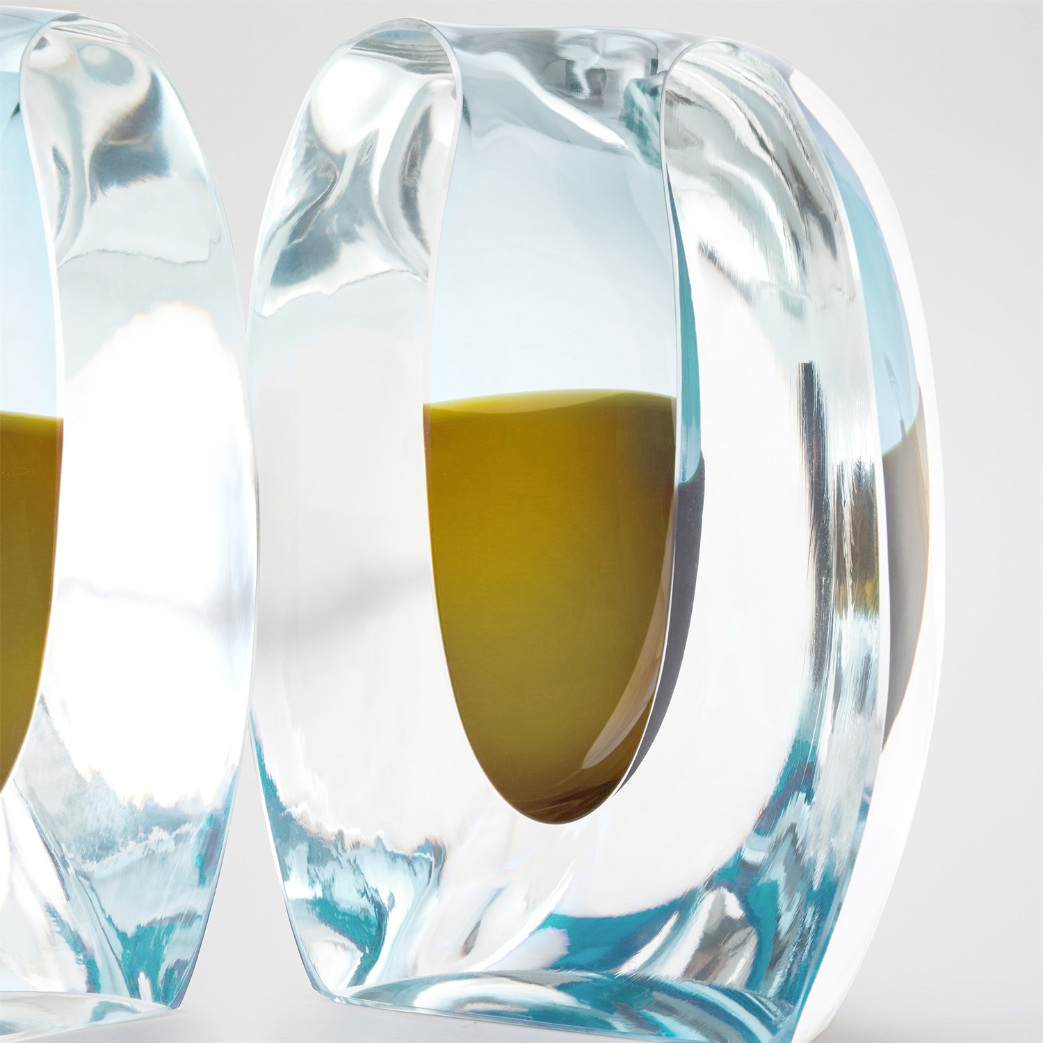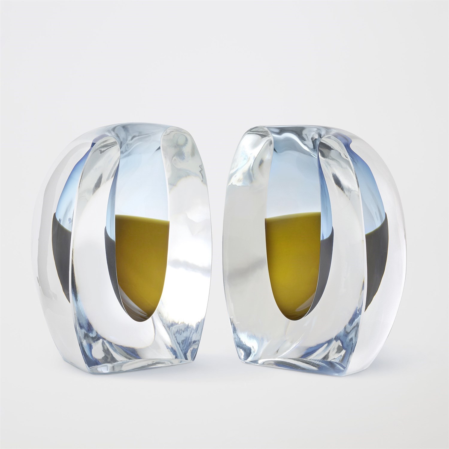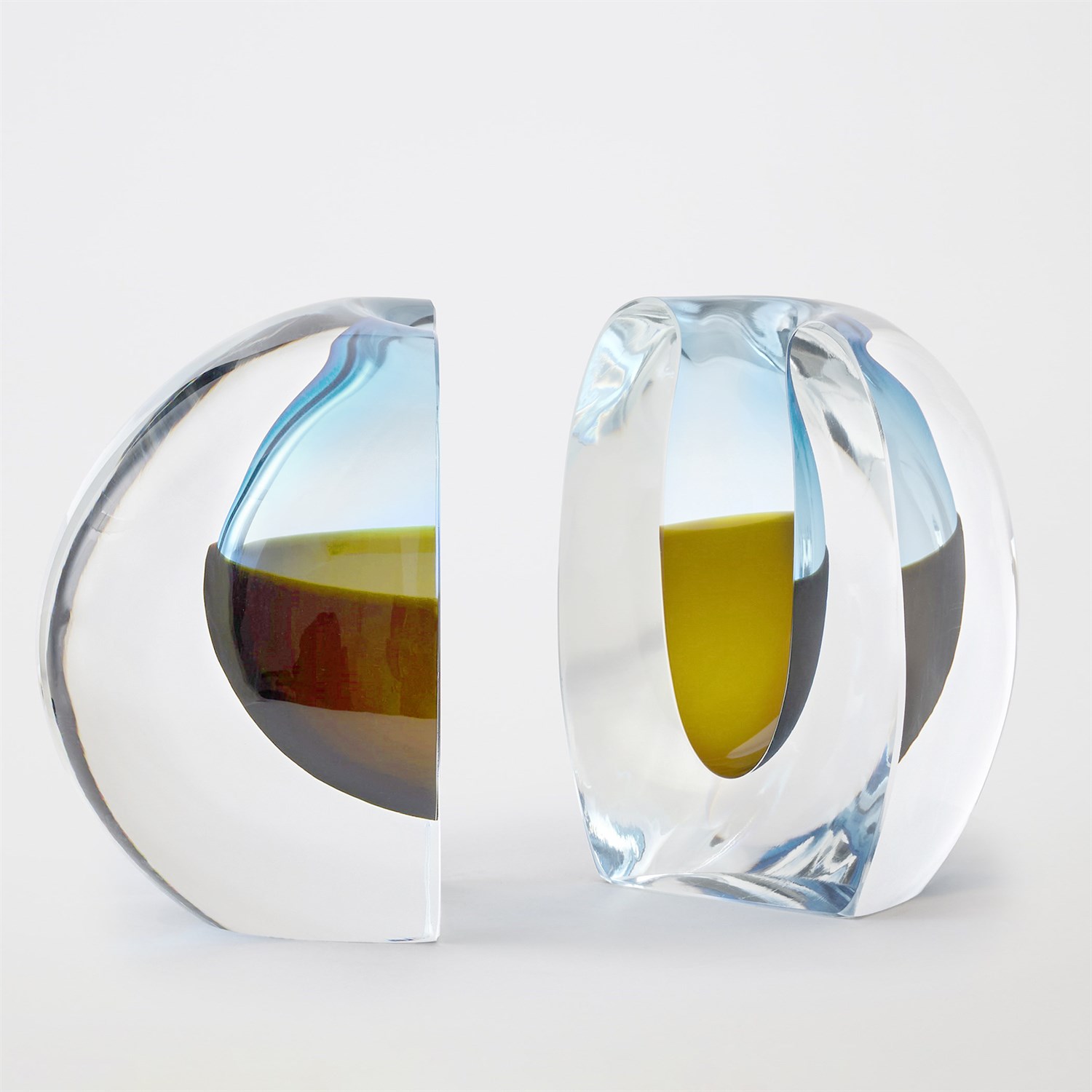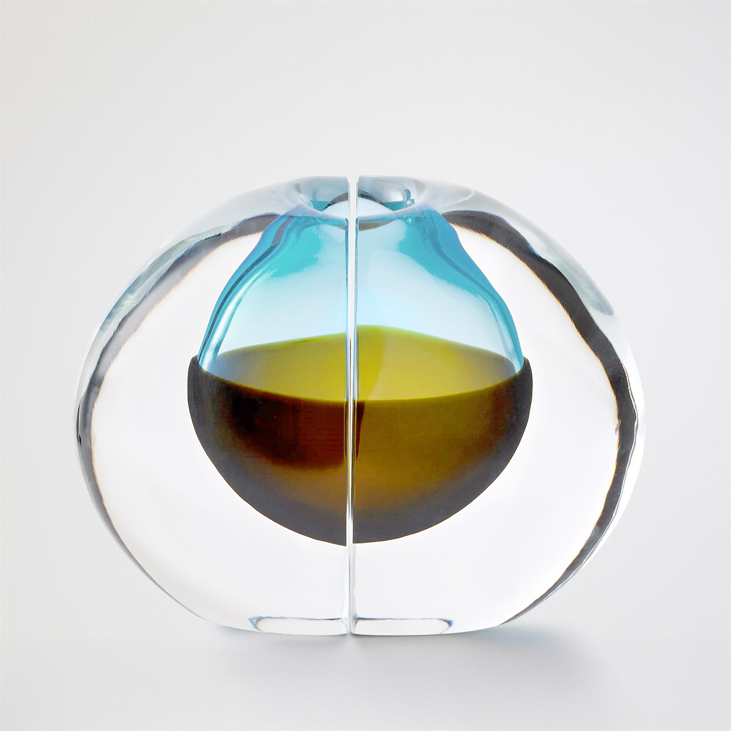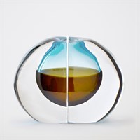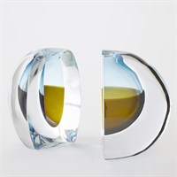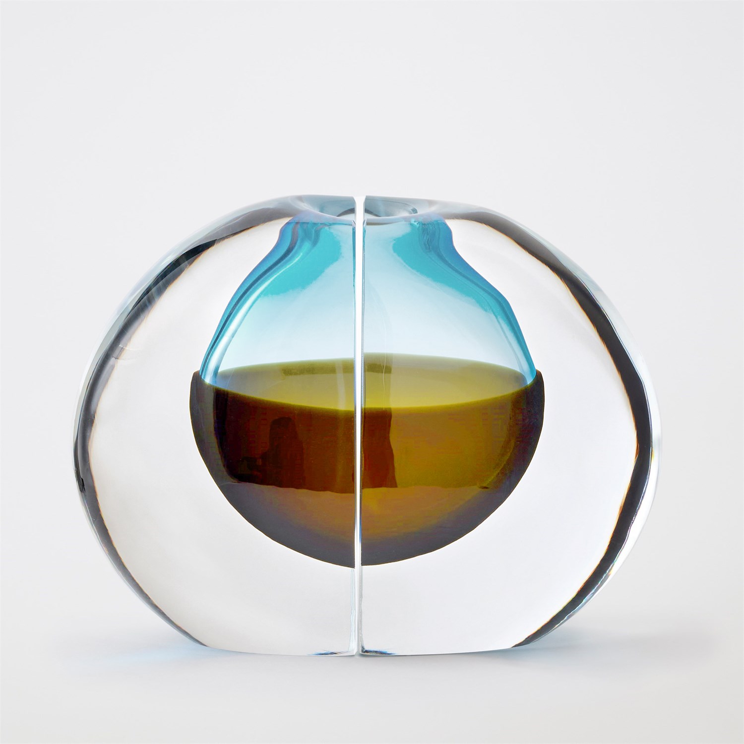 The Split Vase Bookends embody the poetry of duality—two become one, one becomes two. Mouth-blown in Poland, each art glass piece captures a mesmerizing blend of topaz and blue hues. When completed, the bookends are “split,” revealing a captivating interplay of light and color that celebrates the mastery of Polish glassmaking. Also available in sophisticated iris gelp and blue tones, these bookends transform functional design into an artistic statement.