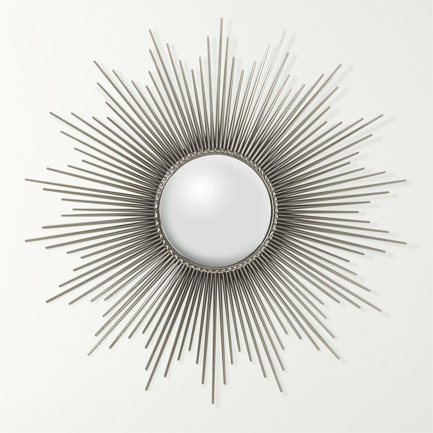Rays of cool nickel extend from a round center mirror forming our Sunburst Mirror. The glowing piece makes a grand statement on any wall.