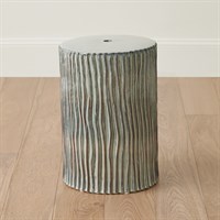 A reactive glaze in layered tones of grey reveals soft shifts of blue and warm brown across the striated ceramic surface of the Textured Wave Stool. Subtle differences in tone and texture speak to the handcrafted nature of the finish. Designed for occasional seating or as a sculptural side table, it is suitable for both indoor and covered outdoor settings.