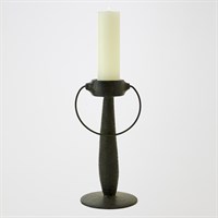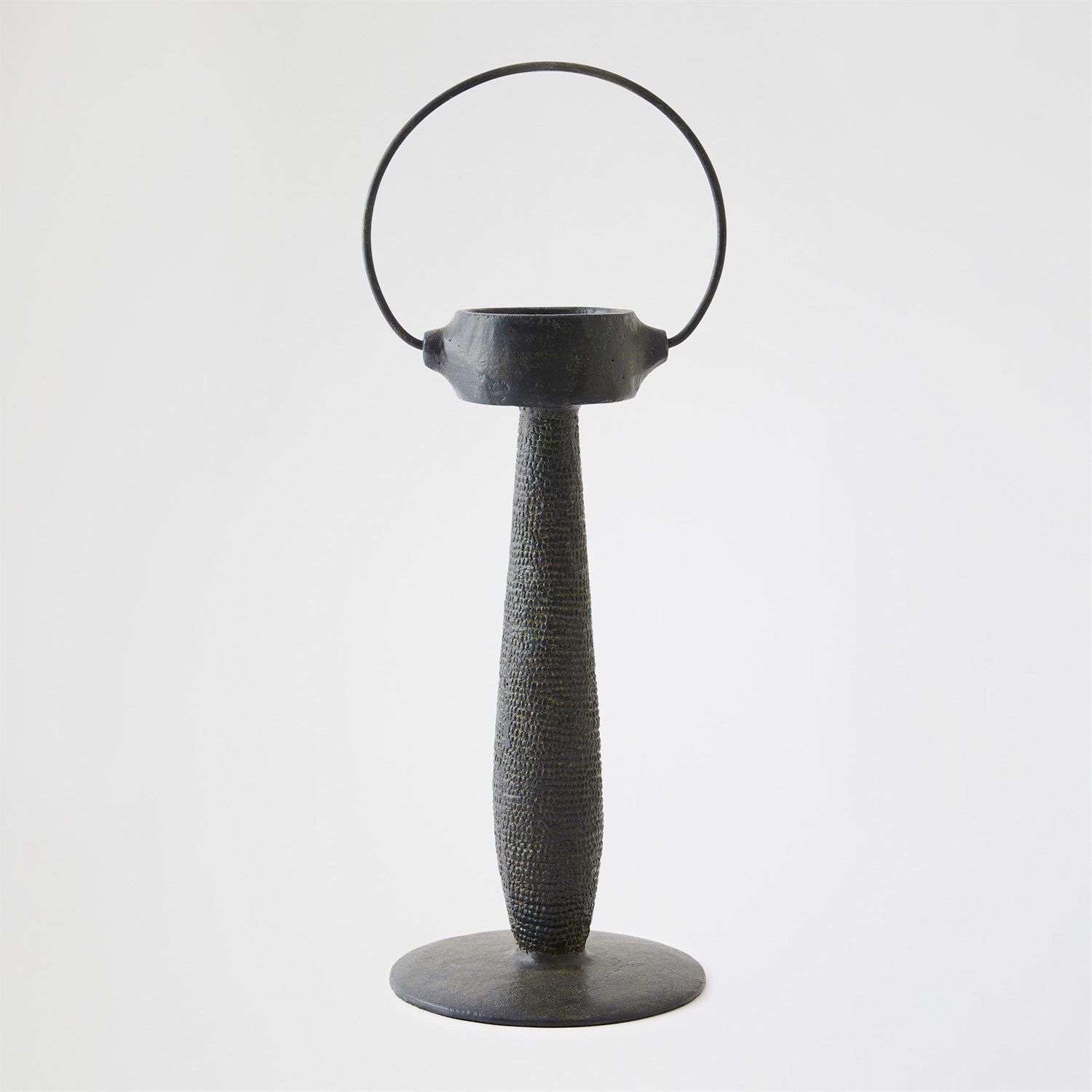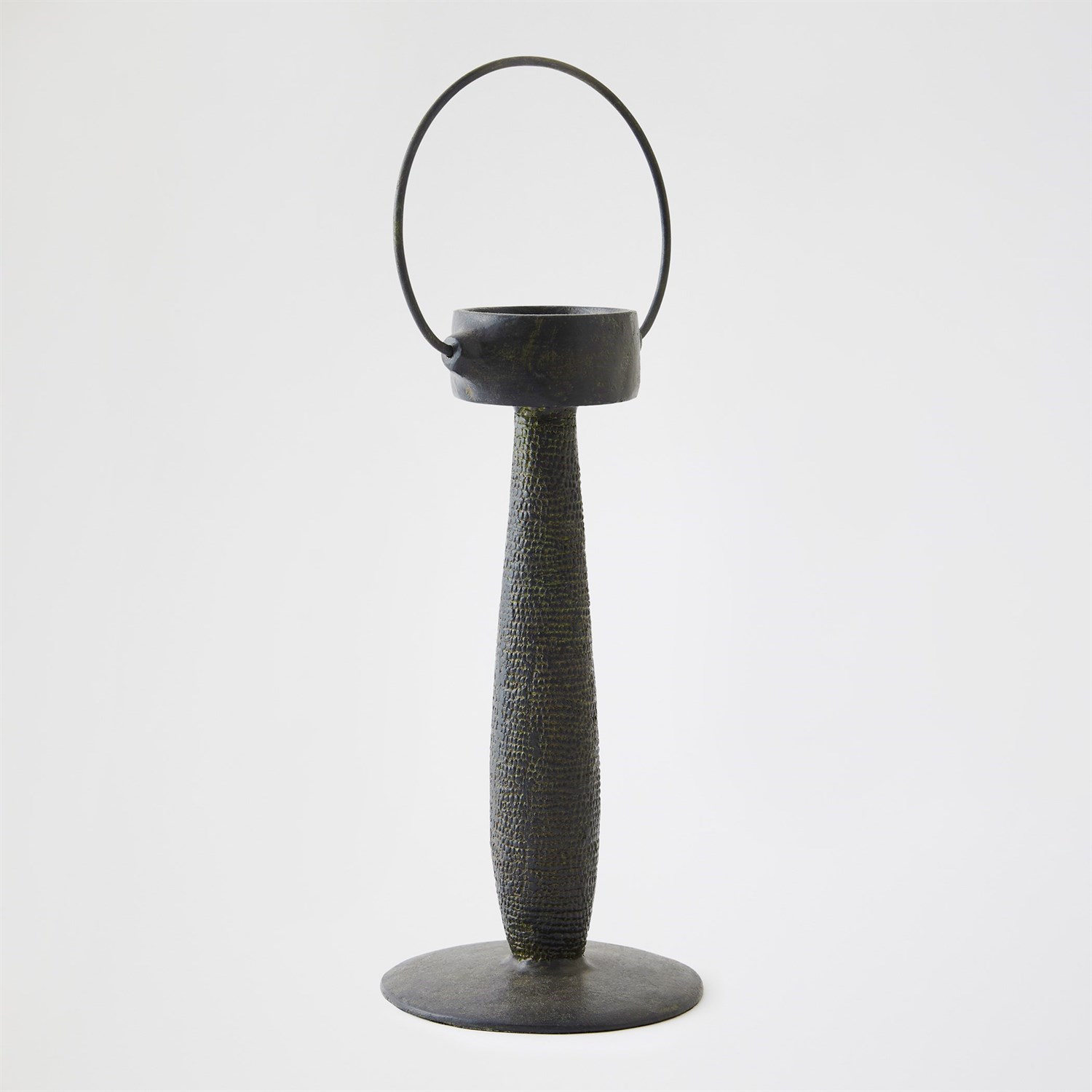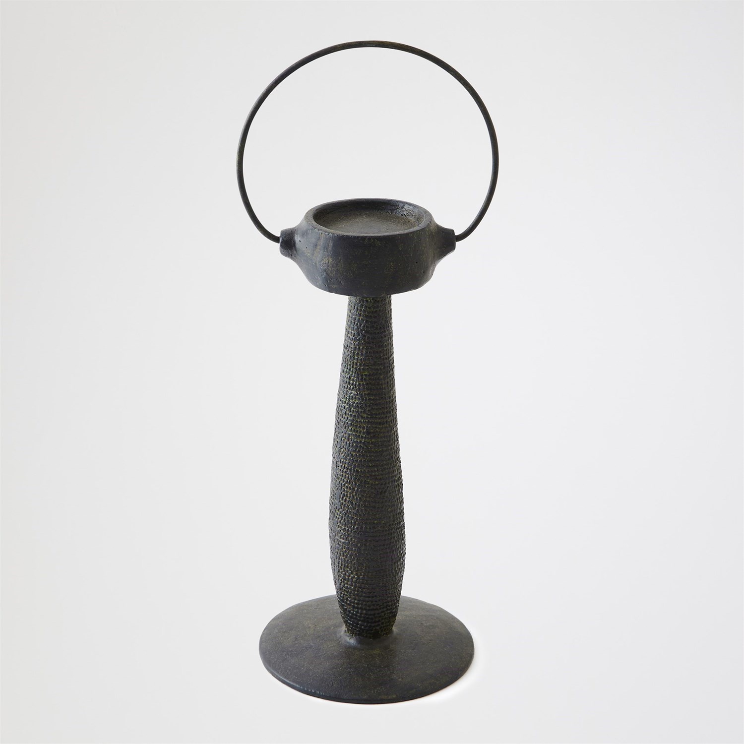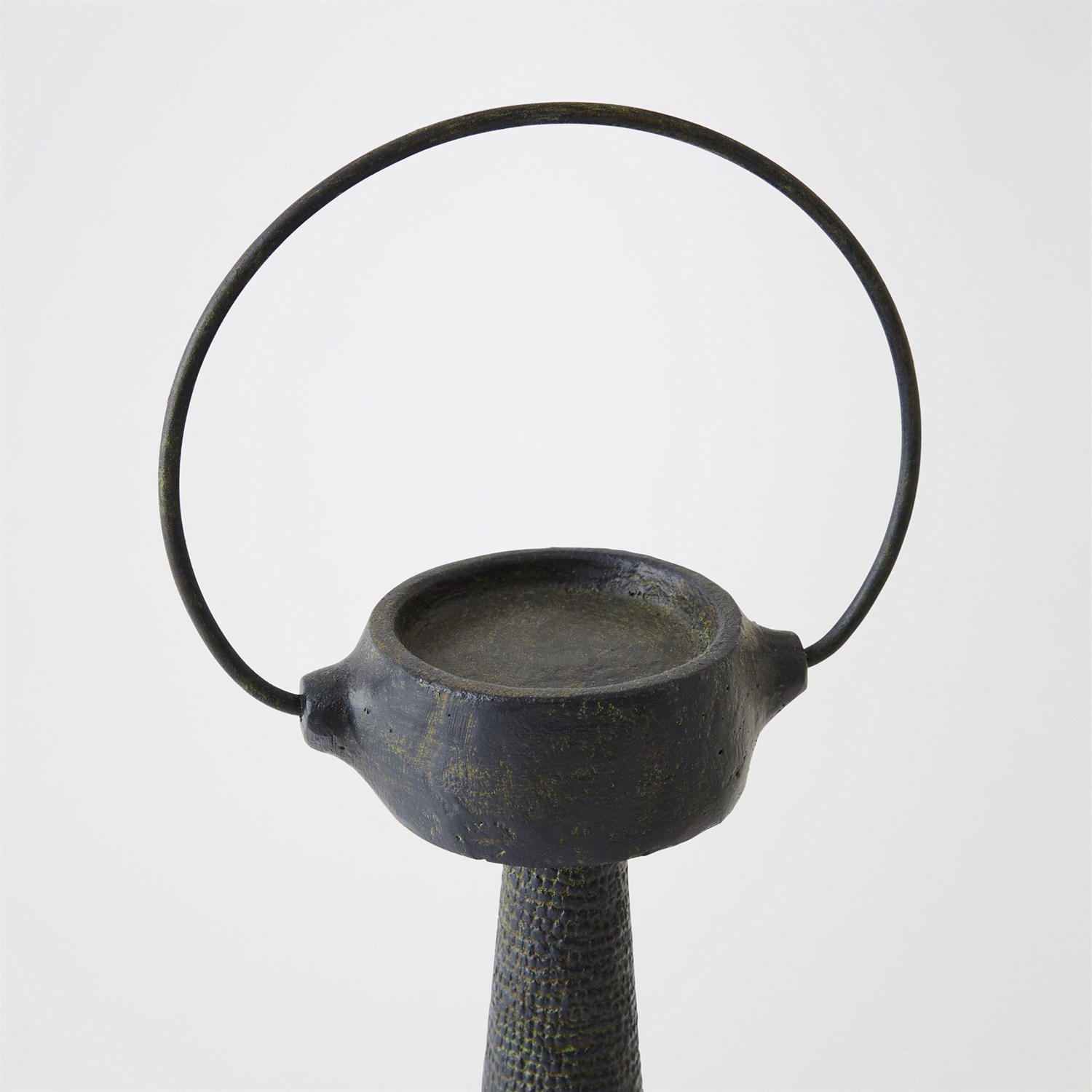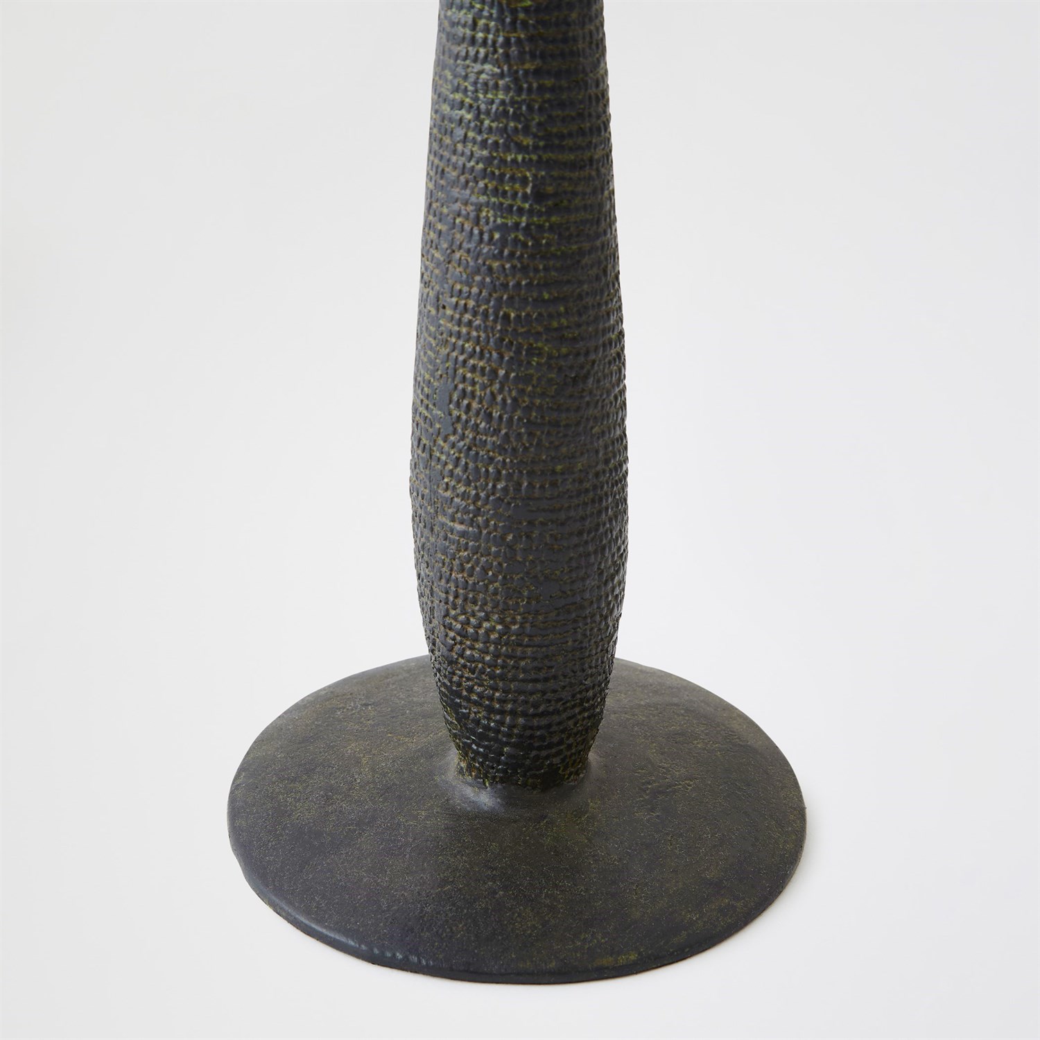 Echoing ancient ritual objects, the Totem Candlesticks hold a 2-inch pillar candle (not supplied). Cast in iron and finished in verdigris, the pair balances industrial geometry with hand-finished detail. The result is both utilitarian and ornamental - objects that turn candlelight into ceremony. Light a candle with intention and even the simplest flame becomes sacred.