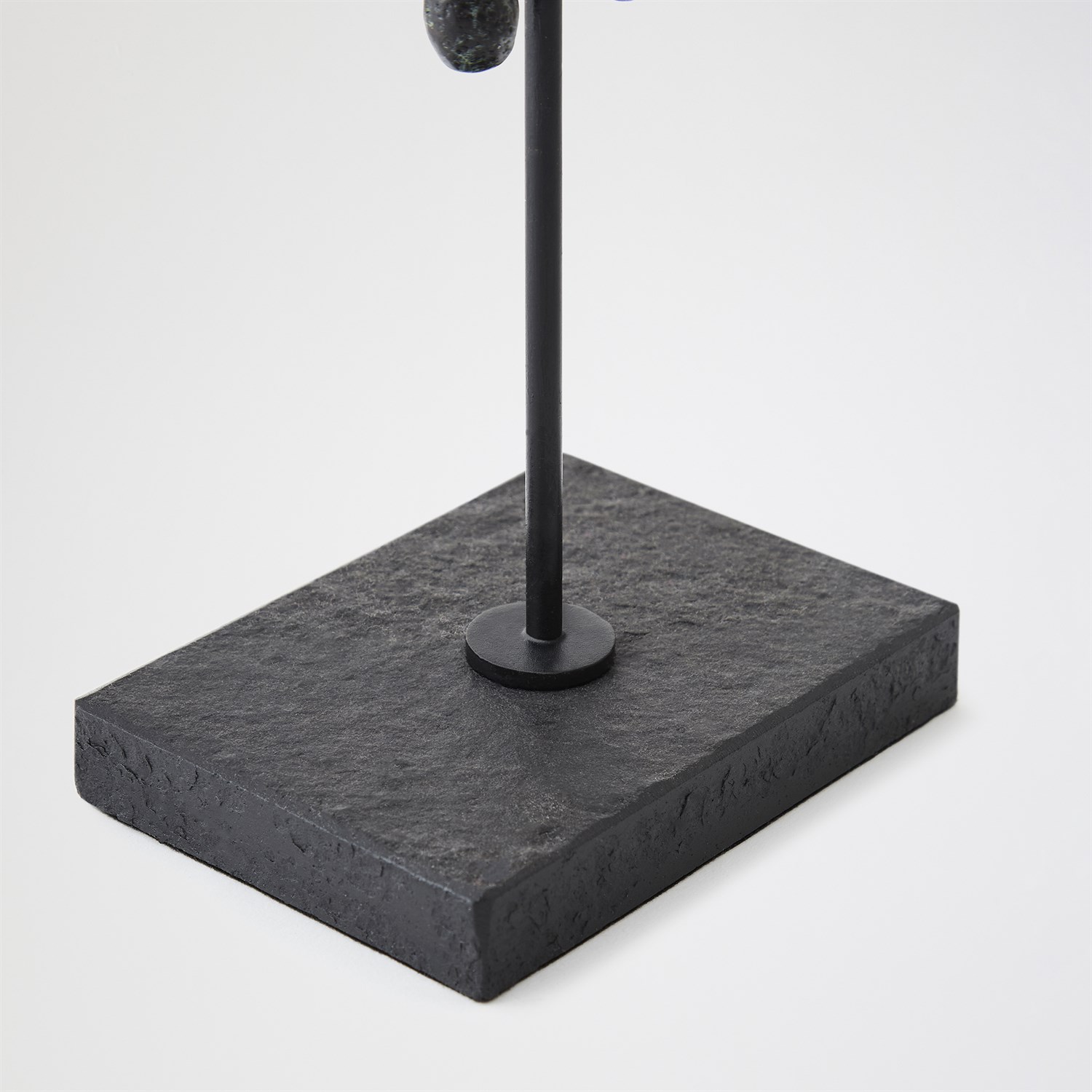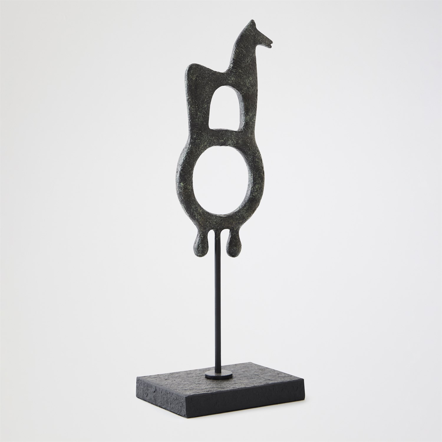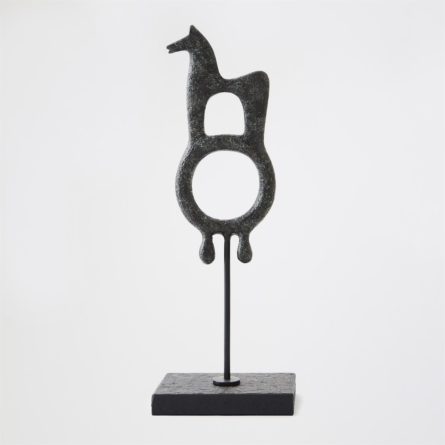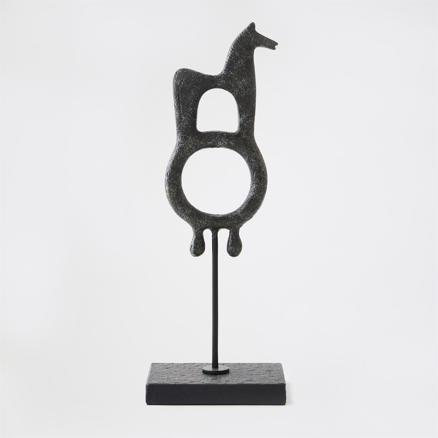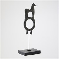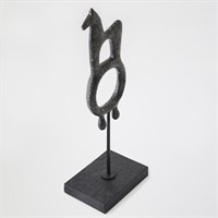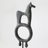 Evoking the mystery of ancient talismans, the Zama and Sarastro sculptures recall sacred symbols once carried through desert civilizations. Cast in iron and finished with a soft verdigris patina, each form balances primal simplicity with sculptural refinement. Standing on slender metal bases, they feel both ritualistic and modern - objects of resonant power. Whether displayed singly or as a pair, Zama and Sarastro embody the enduring conversation between artifact and art. A talisman protects by reminding us who we are when we forget.