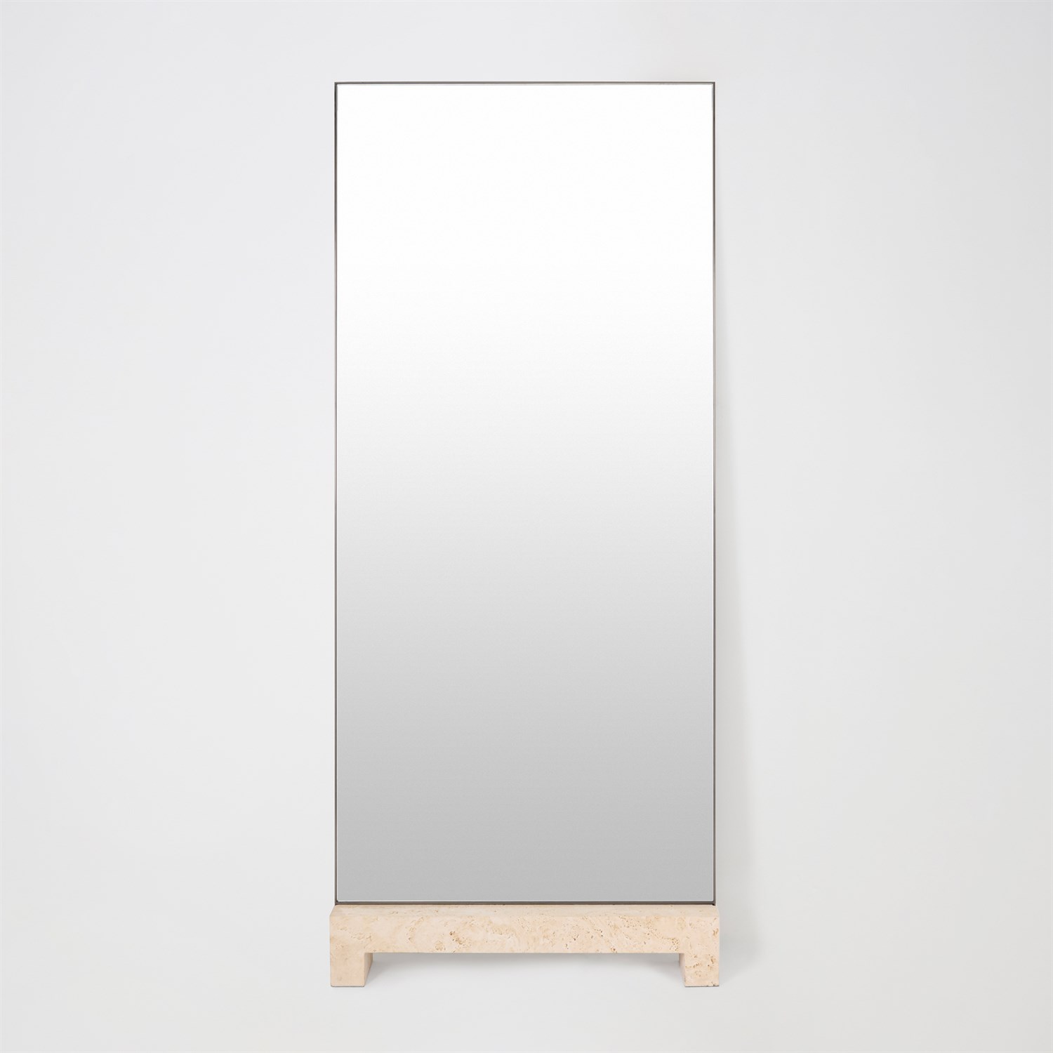The Zuri Floor Mirror rises from a solid travertine base like stone lifted by desert wind. The tall, leaning mirror is framed in plated steel, its surface flush to the stone. It balances mass and reflection, stone and light. To see yourself clearly, you must first stand on solid ground.